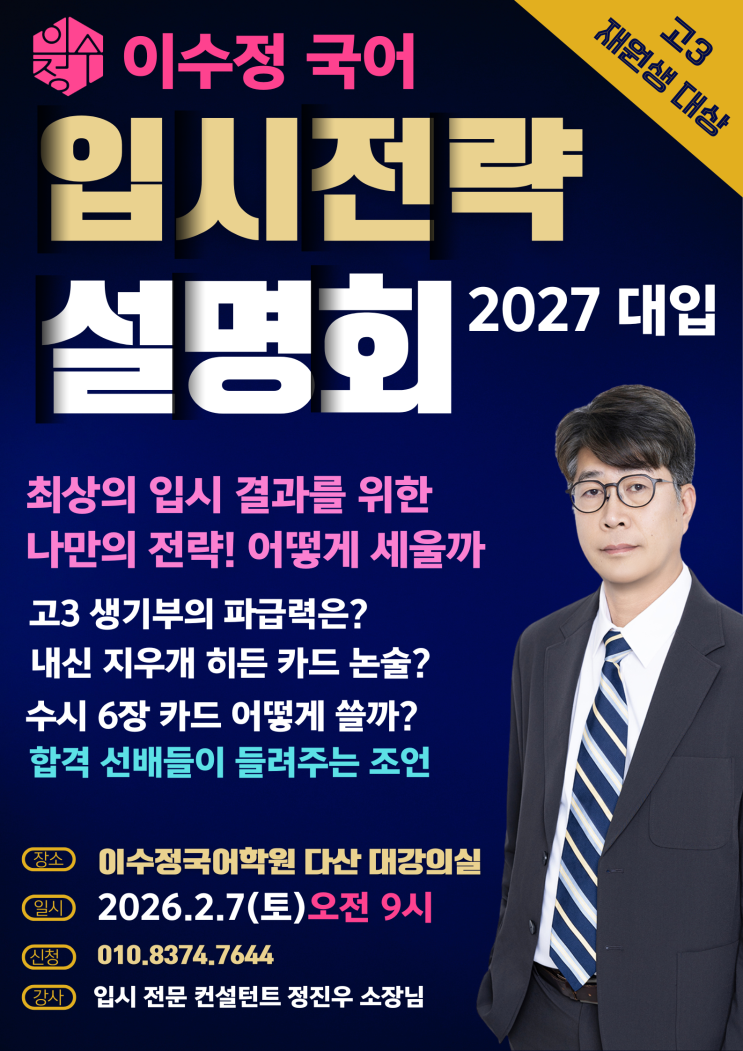 지난 12월 개최된 예비 고3 입시 설명회에 참석하신 학부모님들께서 이런 좋은 정보를 우리 아이들에게 직접 듣게 했으면 좋겠다고 말씀하셔서 이번에는 이수정 국어 고3생들만을 대상으로 설명회를 개최합니다. 전문 입시 컨설턴트 정진우 소장님께서 현재 자신의 위치에서 최상의 대입 결과를 이뤄낼 수 있도록 다양한 입시의 방향을 제시해 드릴 예정입니다. 선택과 전략이 중요한 시기인 만큼 우리 이수정 국어 재원생들이 이 시기에 자신만의 입시 방향을 정하고 집중 공략할 수 있도록 자리를 마련했습니다. 26년 수능을 직접 겪은 선배들이 직접 참여해 현실적인 조언도 해줄 예정입니다. 장소가 제한된 만큼 참가인원은 선착순으로 받습....... <img src="https://blogthumb.pstatic.net/MjAyNjAxMjRfMzkg/MDAxNzY5MjU2NjE1MzE4.lmKdaGyURrdpeXsdmmVNdwproUq9RXm71-U4n53miUgg.E3bcUNIBElj2g0ePsFNGdOmaBDKE5tgLfjFMwYsCVZog.PNG/%B0%ED3_%C0%E7%BF%F8%BB%FD_%C0%D4%BD%C3%BC%B3%B8%ED%C8%B8.png?type=s3" />