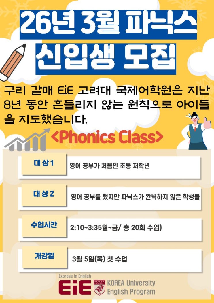 안녕하세요 Mia원장입니다~~ 매번 개강할 때마다 학부모님들의 많은 관심을 받았던 EiE 파닉스반이 3월 신학기를 맞아 개강합니다. ** 기초 Phonics Class** 개강일 : 3월5일(목)요일 : 매일반(월20회) 시간 : 2:10~3:35 수강료 : 월 240,000원 교재비 : 36,000원 **궁금하신 사항은 031-567-0579 또는 010-2654-0579 로 문의주세요^^** <img src="https://blogthumb.pstatic.net/MjAyNjAyMDJfMjk1/MDAxNzcwMDE3NjQ2NTM4.N2065DCChHKl8idxpV_HaaGRLmU-jOImlFPbP2-yUl0g.CqJk9tsI1PGoh4Zlc31lSho36VyEYDyqmpXHu6dlWdMg.JPEG/%C6%C4%B4%D0%BD%BA_%B0%B3%B0%AD%C6%F7%BD%BA%C5%CD.jpg?type=s3" />