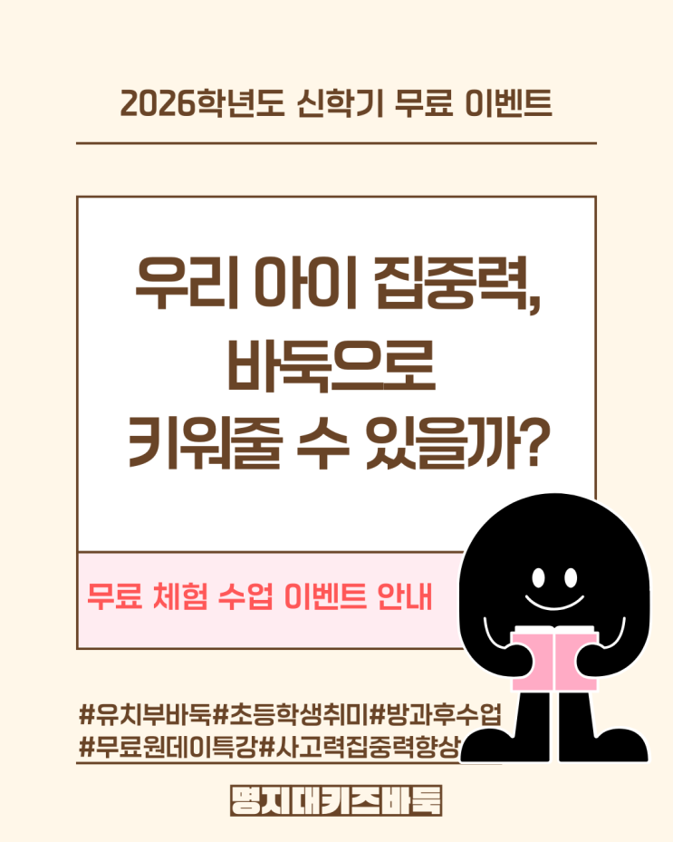 안녕하세요! 아이들의 생각하는 힘을 길러주는 즐거운 바둑 놀이터, 명지대키즈바둑학원(명키바)입니다. ✨ 많은 학부모님께서 아이들의 집중력과 인성 교육을 위해 바둑에 관심을 가져주시는데요. "우리 아이가 바둑을 좋아할까?", "너무 어렵진 않을까?" 고민하시는 부모님들을 위해 명키바가 통 큰 선물을 준비했습니다! 바로 체험 수업료 전액 면제! 무료 체험 이벤트 소식입니다. 왜 바둑이 우리 아이에게 좋을까요? 바둑은 단순한 게임 그 이상입니다. 한 수 한 수 신중하게 두는 과정을 통해 아이들은 놀라운 성장을 경험합니다. 집중력과 인내심: 한 판의 대국을 끝내기 위해 몰입하며 엉덩이 힘을 기릅니다. 논....... <img src="https://blogthumb.pstatic.net/MjAyNjAyMDRfMjI1/MDAxNzcwMTc1NzA0MDUx.oUyJH90uRm5QosJ0eLyj_U31ebIeVFgfnA_YtW9Dd6Qg.vgtC1bVKsDhVzndPP8TnHYDio3u4VHwZM0LD3MYob14g.PNG/1.png?type=s3" />