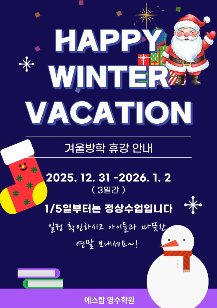 12월말 겨울방학이 있습니다. 1/1일 포함하여 12/31(수)~1/2(금) 까지는 수업이 없습니다. 1/5일부터 학원수업을 하니 방문및 전화상담시 참고 부탁드립니다. <img src="https://blogthumb.pstatic.net/MjAyNTEyMjJfMTg0/MDAxNzY2MzMxMTgxNjM5.wtjPEOLkKHbuKaNoaLHEFlr4cfMPAlTymMMJnqYfX7Ug.opIZeM-Bfyon7b7euG5es4uHfJRrgV2jq4hg4fWJd1cg.JPEG/%B0%DC%BF%EF%B9%E6%C7%D0_%BE%C8%B3%BB%B9%AE.jpg?type=s3" />