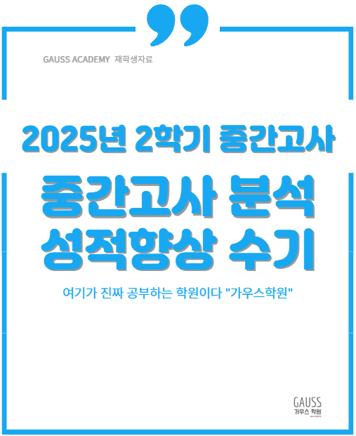 옥련동 가우스학원에서는 시험이 마치면 인송중 옥련중 함박중 송도고 옥련여고 시험지를 수거하여 분석을 하고 데이터를 저장하여 족보를 만들어 다음 시험에 사용합니다. 지난주까지 모든 학교 기말고사 마치고 현재 분석중에 있습니다. 이번 중간고사 모음 블로그를 끝으로 중간고사 분석은 일단락하고 다음주부터 기말고사 분석 자료 업데이트 예정입니다 (12월21일 기준) 자료 수집, 분석에 고생해주신 각 캠퍼스 관리자분들께 감사드립니다. A 각 학교별 25년 2학기 중간고사 분석 모음 B 성적향상 성적우수 수기 모음 C 25년 하반기 전국 수학 평가 결과 D 생활기록부 추천도서 모음 E 초등 뮤엠영어 코스별 커리귤럼 A 각 학교별 25년 2학....... <img src="https://blogthumb.pstatic.net/MjAyNTEyMjFfMTMy/MDAxNzY2MjU0NjM5NTA4.izWfAGPYEbAgHz5CQP-XS1p1gxftJh0lp7AlUhH7jfYg.U45qKAuAVtzCPj2SY8JuTjgVcgjMCESzUUvy4YrGXrcg.PNG/image.png?type=s3" />
