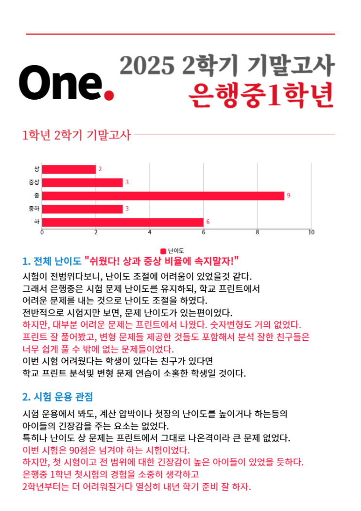 안녕하세요. 원포인트수학입니다. 은계지구 은행중학교 2학기 기말고사 분석입니다. 1학년은 쉽게 나왔습니다. 대부분 프린트에서 나왔기에 성실하게 공부한 아이들은 쉽게 접근이 가능했습니다. 은계수학학원 원포인트수학의 시험 분석에서 프린트 유사성도 첨부했습니다. 2학년은 중간고사가 너무 쉬웠기에 이번 기말고사는 중상 난이도 문제의 비중이 조금은 높았습니다. 그렇다고 어려운 문제들이 많은 시험은 아닙니다. 난이도 상은 2문제였고, 그 문제들도 쎈B단계의 흔한 상 문제 수준이었습니다. 분석표를 봐주시면 감사하겠습니다. <img src="https://blogthumb.pstatic.net/MjAyNTEyMjFfNTIg/MDAxNzY2MzE4MDIzMTAy.U_vZQO_uy34JY_HY8Czz8b2dn9dSTB5YspCn0uXj6u4g.EBAA9FZtBfEtW_pBdybfa_acm6fbl37Zy_DOCEGsINIg.PNG/009.png?type=s3" />