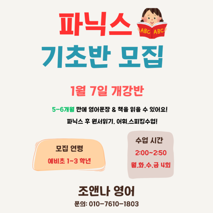 안녕하세요! 조앤나쌤 입니다. 1월부터 함께할 파닉스 기초반 모집합니다^^ 글자와 음가부터 차근차근 배웁니다. 5-6개월이 지나면 리딩이 가능하며, 이후 정규반에서 리딩+어휘수업과 함께 스피킹수업을 합니다. 쉽고 즐겁지만 효과는 확실한 조앤나 영어파닉스! 예비초 1-3학년들의 많은 관심 부탁드립니다^^ 문의: 010-7610-1803 <img src="https://blogthumb.pstatic.net/MjAyNTEyMjFfNTcg/MDAxNzY2MzEyMDI2Njg5.jlaO0VVs785K1XsgQu-cbEZgAkwD3vK0FC-ySEmW4dIg.WgPOcEZaid6Mr1tKiAJTUk5D_b_iFP_H34cU0M0Bd0kg.PNG/2.png?type=s3" />