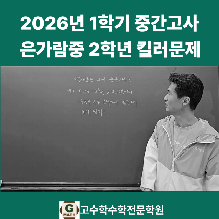 안녕하세요, 고수학학원입니다. 우리 은가람중 친구들 중간고사 준비하느라 정말 애썼습니다✨ 이번 은가람중학교 2학년 수학 시험은 변별력을 확보하려는 학교 측의 의도가 뚜렷하게 보였습니다. 점수대별로 명확한 격차가 벌어진 이번 시험, 무엇이 승패를 갈랐을까요? 은가람중2 수학 중간고사, '실수'가 아니라 '실력'이었습니다 2학년 수학 핵심문제풀이 과정을 보고 다시 한 번 자신의 것으로 익히면서 공부 방법에 도움이 되길 바래봅니다. 2026년 1학기 은가람중 2학년 킬러문제 객관식 21번 문제 풀이영상 ▶ 핵심문항 21번 문제 이제 중간고사는 끝났지만, 우리에겐 1학기 기말고사를 앞두고 있습니....... <img src="https://blogthumb.pstatic.net/MjAyNjA0MzBfNDMg/MDAxNzc3NTQzNDM3Mzk5.KY9Kk8rhp7QJAwobXYFusSZxsM8vmXzCEcLJ5zc6uqEg.ipjo7PT4aEWME5XyUR0001WTfIbE9UWu7hapYsBs2xMg.PNG/%C1%A6%B8%F1%C0%BB-%C0%D4%B7%C2%C7%D8%C1%D6%BC%BC%BF%E4_-002_%2812%29.png?type=s3" />