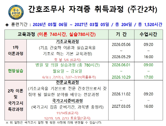 2026년 5월 6일 ~ 2027년 3월 5일까지로 총 204일 총 1520시간 이론수업이 9시 20분~ 16시 까지 진행됩니다. 속성!!!!으로 하루 7교시 수업입니다. 상반기 마지막 개강입니다!!! 신갈간호학원은 취업률우수 훈련비 우대기관입니다. 간호학원을 다니는 이유 중 대표적인 이유는 취업이겠죠? 신갈간호학원의 2024년도 취업률은 90.4%로 전국 간호학원의 평균 취업률보다 5%이상 높아 고용노동부 지정 취업률 우대기관이며, 용인시 최고입니다!! 수년간의 노하우로 다져진 독보적이며 체계적인 운영시스템과 우수한 경력의 강사진을 보유한 학원 바로 신갈간호학원입니다.^^ 자격증 취득과 함께 최상의 취업을 보장합니다. 용인시에서 유일한 5년 인....... <img src="https://blogthumb.pstatic.net/MjAyNjA0MjFfMzUg/MDAxNzc2NzQ4OTM0MjUw.g8sbY-0cWtkDI6EQMKqOU1QIEbfff6hEu43an_TVbQ0g.pmm22zGNwo6HYOkXvQLuC66DDAfPAxd2LwU2uDlpRU4g.PNG/image.png?type=s3" />