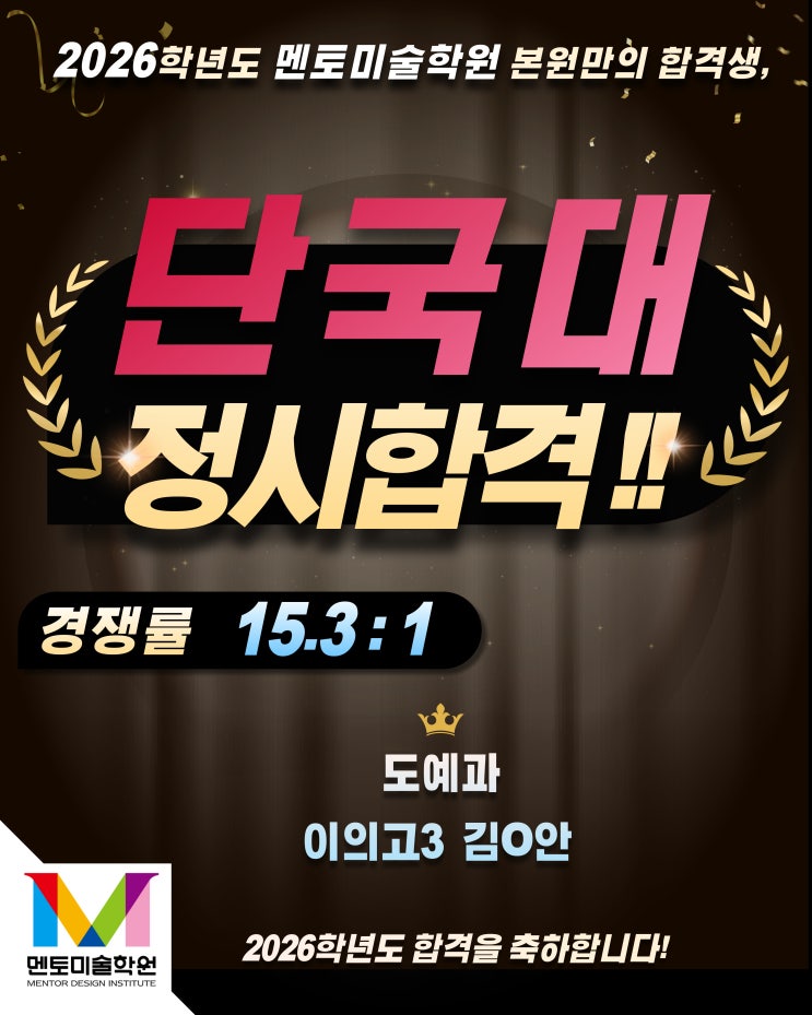 안녕하세요 여러분~!! 멘토미술학원입니다. 멘토 입시반 합격행진!! 2026 단국대학교 정시합격 해주었습니다. 계속 진행 중인 멘토미술학원 합격소식! 현역 고3에 단국대학교 죽전캠 합격이라니, 정말 대단합니다! 경쟁률 15.3 : 1 단국대 도예과 합격 멘토 입시반에서 단국대학교 죽전캠퍼스 합격생이 나왔습니다. 정말 열심히 연장 수업에 참여하며 고생많았습니다!! 합격을 축하합니다~! 멘토미술학원에서는 실기 경력 상관없이 빠르게 실전 실기력 상승 가능합니다. 미대입시에 최적화 된, 체계적인 입시시스템이 갖춰진, 학원을 선택해야 합니다. 2026학년도 단국대 정시 합격 명단입니다. 밑의 멘토미술학원 신입 상담 예약 폼 링크로 미대....... <img src="https://blogthumb.pstatic.net/MjAyNjAyMDdfMjA2/MDAxNzcwNDI2MTE1OTY4.xxPPJO5I9XlmbmTbMzzhPoQPa2v-P0ximbBkD-Kmkb8g.b0ff4EB-YQKA4amyXjgWv30sFBG3Ej66kopVeE5xlbgg.JPEG/%C0%CE%BD%BA%C5%B8-%C7%D5%B0%DD%C0%DA_%BA%B9%BB%E7%BA%BB-002_%283%29.jpg?type=s3" />