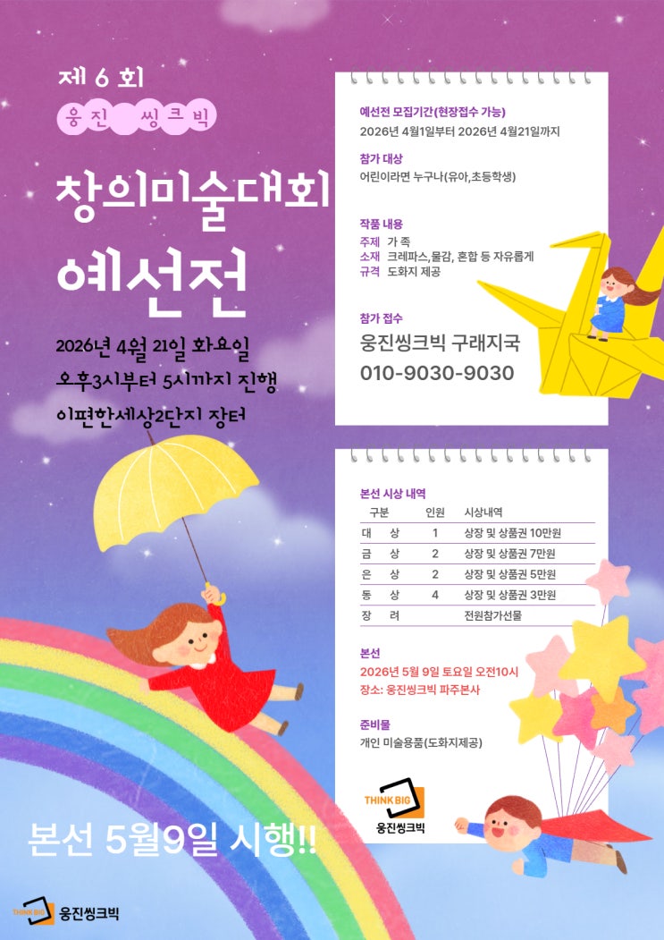 구래학원지기입니다. 오늘은 좋은 정보 하나 알려드릴려구요!! 저희 웅진씽크빅에서 창의미술대회를 진행합니다. 벌써 6회째인데 아무도 모르시죠? 웅진씽크빅 창의미술대회는 유,초등 아이들의 꿈과 창의력을 키워줄 수 있는 대회입니다. 이번 6회 대회에서의 주제는 가족이구요!! 저희 지국에서도 예선전을 진행하려고 합니다. 본선은 웅진씽크빅 파주본사에서 진행됩니다. 2026년 5월 9일 오전10시부터 오시면 많은 선물과 역사관투어까지 가능하오니 아이들에게 좋은 경험이 될 수 있게 해주세요!! 아이들을 생각하는 웅진씽크빅 구래학원은 공부도 재미있게 성적도 향상!! 다양한 이벤트로 아이들 얼굴에 늘 미소가 띄울 수 있게 노력합니다....... <img src="https://blogthumb.pstatic.net/MjAyNjA0MTRfNjUg/MDAxNzc2MTU0ODQzOTIw.vpiW0R489Z0HFLGW91JecreAl6b4UypAEYTsSUX83fgg.svjvWSUWej4ZuOv_40V5ZoYgWimQr4xyUJaV7JxrLKsg.JPEG/%C3%A2%C0%C7%B9%CC%BC%FA_%281%29.jpg?type=s3" />