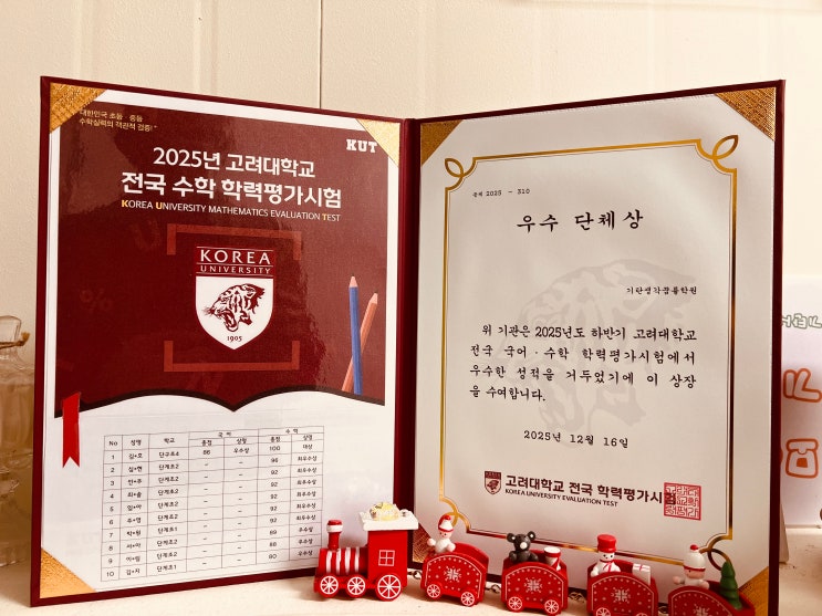 안녕하세요~ 단계초 생각꿈틀학원입니다. 며칠 전, 11월 22일에 치러진 고려대 수학학력평가시험에서 우리 생각꿈틀학원 친구들 참가자 전원 수상과 우수 단체상이라는 정말 기쁜 소식이 전해졌습니다. 사실 '전원 수상'이라는 말만 보면 "원래 잘 하는 아이들만 시험 봤나?"라고 생각하실 수 있습니다. 그런데 꼭 잘 하는 아이들만의 이야기는 아니었습니다. 대부분의 아이들이 처음에는 문제를 끝까지 읽지도 않고 풀었고, 조금만 어려워지면 "이건 못 풀어요"부터 말하던 아이들, 연산 실수가 많아서 점수가 실력보다 늘 낮게 나오는 아이들까지 모두 같은 출발선에서 시작했습니다. 수학학력평가시험 준비 과....... <img src="https://blogthumb.pstatic.net/MjAyNTEyMjFfNzUg/MDAxNzY2Mjg5NjkxMzAw.Qk7RHvHtthm9iCWGfROyGzgYde8PHDdqm4XSoO1X9MUg.oCvJEoeS4iMSZ0vCpvQaJMmYaBJN9I_oSstaV2tXUZsg.JPEG/KakaoTalk_20251220_155547580_29.jpg?type=s3" />