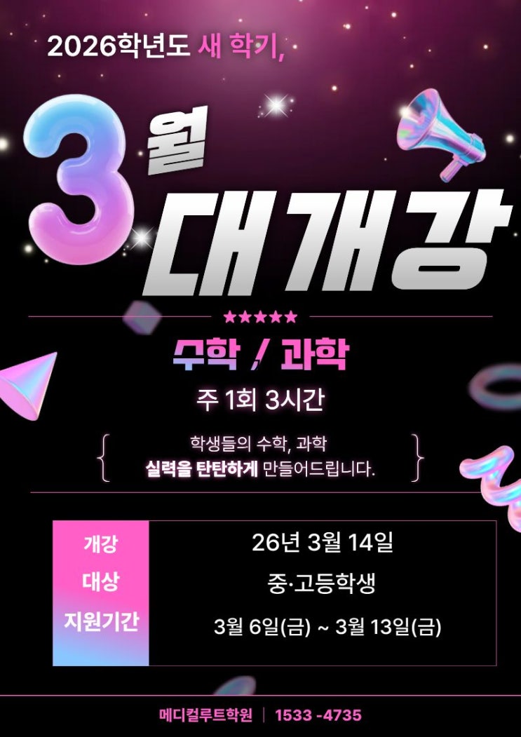안녕하세요. 메디컬루트학원입니다. 2026학년도 새 학기를 맞아 3월 대개강이 진행됩니다. 메디컬루트학원은 학생 개개인의 철저한 학습 관리를 통해 수학·과학 실력을 탄탄하게 만들어가는 학원입니다. 단순한 문제 풀이가 아닌 개념 이해부터 심화 문제 해결까지 단계적으로 지도하며, 학생들이 스스로 공부하는 힘과 올바른 학습 습관을 기를 수 있도록 지도하고 있습니다. 이번 3월부터 중·고등학생을 대상으로 수학·과학 수업이 시작되며, 주 1회 3시간 집중 수업으로 깊이 있는 개념 학습과 문제 풀이를 진행합니다. ☑️ 개강 : 2026년 3월 14일 ☑️ 대상 : 중학생 / 고등학생 ☑️ 과목 : 수학, 과학 ☑️ 수업 : 주 1회 3시간 집중 수....... <img src="https://blogthumb.pstatic.net/MjAyNjAzMDZfMjQy/MDAxNzcyNzk0Mzc5MDIz.4utkYznZ4ovbBIL0oRZaxcdJfPHuVplK6xwRuHR5fhog.LH1dTr-8wQAVWhDBG9YqDUo58EiEnX8berZJwNlpBEAg.JPEG/10.jpg?type=s3" />