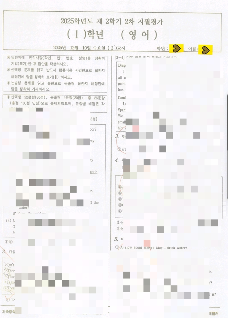 2025년 지축중 1학년 2학기 영어 기말고사 분석 안녕하세요, 펠톤영어학원입니다. 아래 내용은 2025학년도 지축중 1학년 2학기 영어 기말고사를 기반으로 한 전문 분석 자료입니다. (학생 제공 시험지 참조) 1. 시험 구성 개요 1-1. 기본 정보 학교: 지축중학교 학년/학기: 1학년 2학기 평가 유형: 2차 지필평가 문항 수: 객관식 + 서술형 포함 1-2. 시험 구성 요소 짧은 생활 회화 대화문 단문 독해 및 어휘 판단 문제 Zero-Waste, 여행 편지 등 주제 독해 일정표·행사 안내문 등 실용문 독해 서술형 문장 쓰기 문제(WH-의문문, 문장 구성 등) <지축중 시험의 핵심 특징> 기초 독해 비중 높음 문맥 기반 어휘 판단 능력 필요 서술형은 “....... <img src="https://blogthumb.pstatic.net/MjAyNTEyMTFfMjYg/MDAxNzY1NDUwMjI4MzIx.GEgOthSo2Kd9YXdIdxK6oE2aUEeDNbd5kLETFpr34uEg.GKor8DIa3QGSCRCP1LEAFNUk1NHpKczVzC5UqShpF9Yg.PNG/image.png?type=s3" />