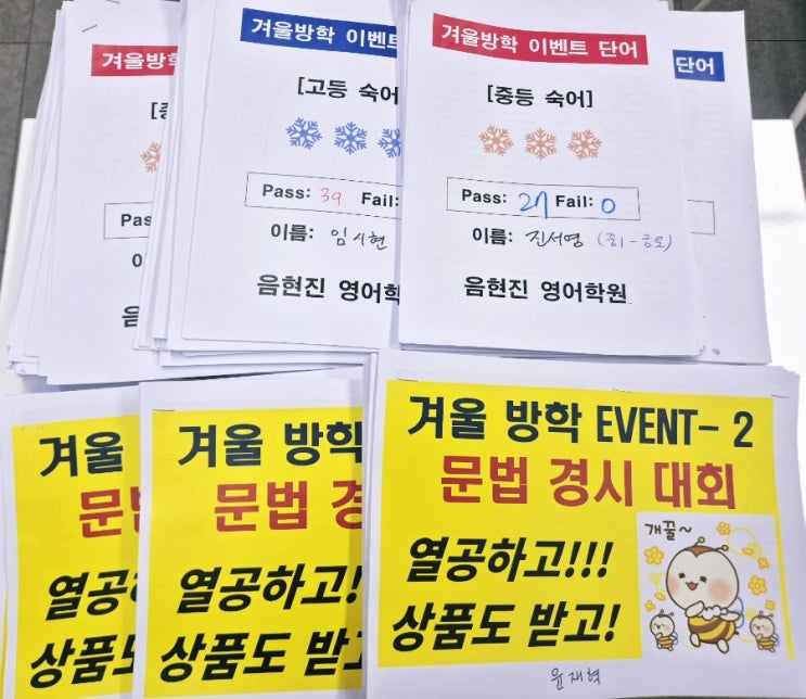 안녕하세요 이제 다음주면 길~었던 겨울방학이 끝납니다. 겨울방학 동안 두가지 이벤트를 진행 했습니다. 첫번째 중등 고등 구동사 암기는 끝났고 두번째는 문법 경시 대회가 다음주 금요일 입니다. 방학동안 오전부터 나와서 공부한 재원생들도 많습니다. 재원생들에게 골고루 칭찬의 상품이 돌아가길 바라면서 이벤트를 진행 합니다~ 3월 새학기 모두모두 화이팅 입니다!✌️ <img src="https://blogthumb.pstatic.net/MjAyNjAyMThfMTM3/MDAxNzcxNDI1Mzg2Mjk2.r_6edpepVLC1otjI8xHI1re6oUlSvklD9GypsRaXhNUg.g2GHYTmlk2y0BeCCbbBgGuCUSRvPKaSM08x2xRhhTw0g.JPEG/900%A3%DF1771425385608.jpg?type=s3" />