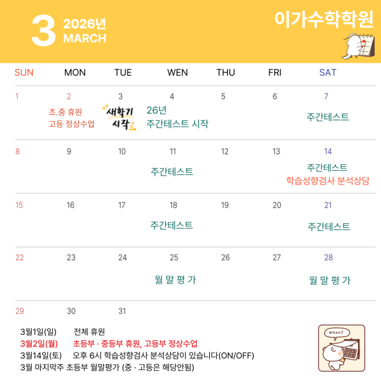 안녕하세요 학생들의 수학 공부에 진심인 서대문수학학원 이가수학학원입니다!! 따뜻한 봄기운과 함께 드디어 신학기 3월이 시작되었습니다. 새로운 반, 새로운 교실, 새로운 목표. 아이들에게는 설렘이, 학부모님들께는 기대와 걱정이 함께하는 시기일 것 같습니다. 이가수학학원도 아이들의 힘찬 출발을 위해 3월을 꼼꼼히 준비했습니다! 3월 학사 일정 안내 ✔ 3월 1일(일) : 전체 휴원 ✔ 3월 2일(월) : 초·중등부 휴원 / 고등부 정상수업 진행 ✔ 3월 4일부터 : 2026년 주간 테스트 시작 새학기와 함께 학습 점검도 시작합니다. ✔ 3월 14일(토) 오후 6시 학습성향검사 분석 상담 (온/오프라인) 아이의 학습 성향과 강·약점을....... <img src="https://blogthumb.pstatic.net/MjAyNjAyMTlfMjcg/MDAxNzcxNDY1ODE3NTYy.MAW1zw-Rtf8ctiFNcDDEdg6el1yID4yIBGmXIA8i63kg.u8q4yuGL21-QwS891eojahqoshLXYEnM_w9z62S2HRMg.PNG/%BF%F9%BA%B0%C0%CF%C1%A4%C1%A4-008.png?type=s3" />