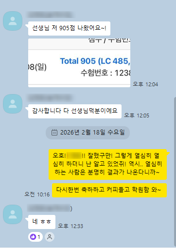 지난 2월 8일 토익 시험 결과가 드디어 나왔습니다! 티플러스어학원 수강생의 성적표를 함께 보실까요? LC 485점 / RC 420점 — 총점 905점! 라는 훌륭한 성과를 거두었습니다! 노력의 과정 평소에도 모르는 문제는 즉시 질문하고 틀린 문제는 왜 틀렸는지 분석하며 선생님과 지속적으로 상담 이러한 과정이 쌓여 LC 거의 만점급, RC도 높은 점수, 총 905점이라는 멋진 결과로 이어졌습니다! 티플러스어학원 식구들에게 한마디 시험 준비 중에는 좌절도 있었고, 막막할 때도 있었지만 포기하지 않고 끝까지 달려온 여러분, 정말 수고 많았어요 이번 성적이 여러분의 영어 자신감을 더 크게 키워주길 바랍니다! ....... <img src="https://blogthumb.pstatic.net/MjAyNjAyMjBfMTQy/MDAxNzcxNTUwMTE5MTEx.cov8_8V6EfymA3a7J44W2jyv5Jqx55a5MY8b4YLQ7_Eg.pNa5r40HNC2xU8rT73oQ2gcGz5v6rDYOvQJGuquMoIog.PNG/260220_%B1%E8%BF%B5%C0%BA.png?type=s3" />