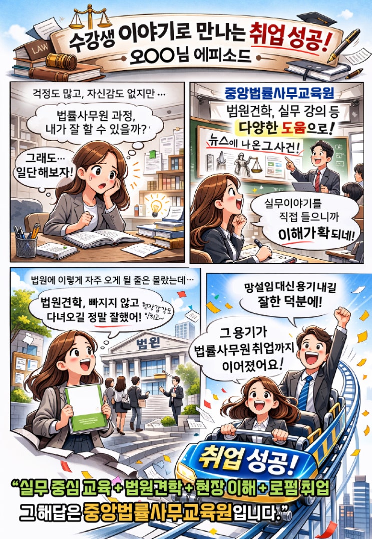 [수강생 이야기로 만나는 취업성공 #9] 걱정 많던 시작, 용기 낸 선택이 취업 성공으로 이어졌습니다. 실무 중심 교육부터 법원견학까지 결과로 증명하는 중앙법률사무교육원. 자세한 상담을 희망하시는 분은 교육원으로 유선연락 바랍니다 02-525-1007 <img src="https://blogthumb.pstatic.net/MjAyNjAyMjBfMTcw/MDAxNzcxNTUyODAwNzAy.Kxvv7Hhb3TqC9xnb31C0YJu9T4f2rBVDNI8Ao50VCesg.pjKZuzoU_WfdOdZ8bsSVoEKVHCJf6H0DcqaPyck0RC0g.JPEG/4%C4%C6%B8%B8%C8%AD_20260219.jpg?type=s3" />