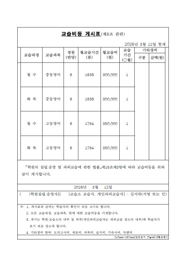 교습비 안내