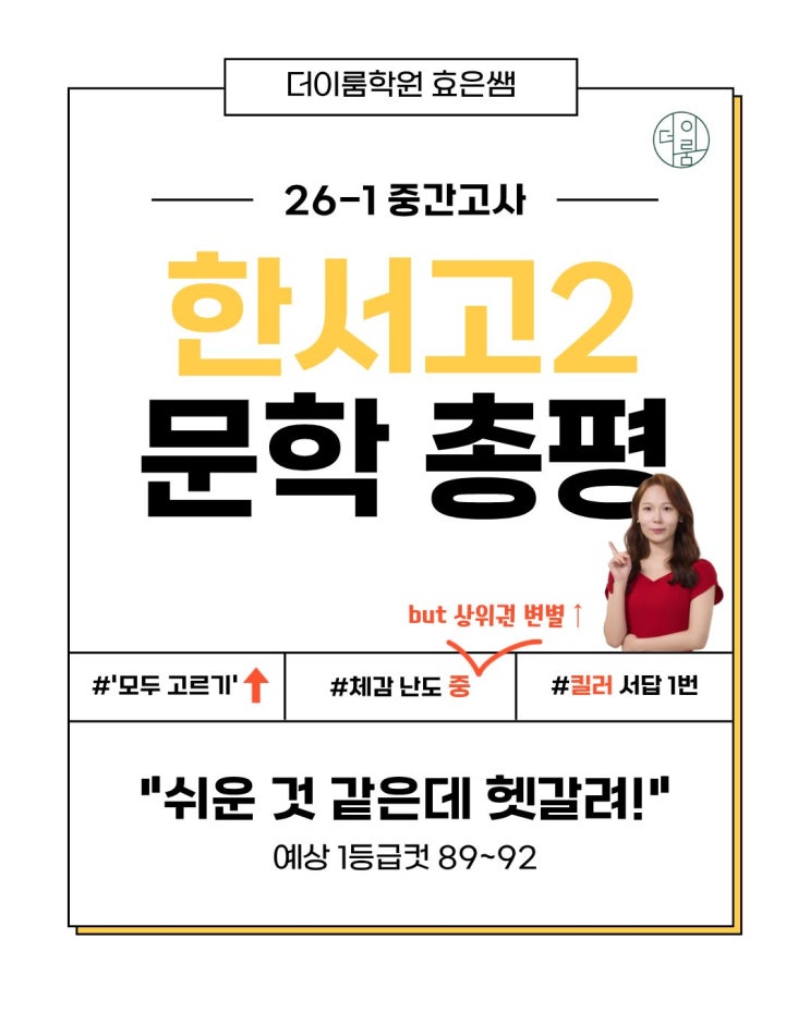 안녕하세요. 효은쌤입니다. 대망의(?) 한서고2 문학 시험이 끝났습니다. 학생들이 2학년 되어 수학과 탐구 과목 공부량이 늘고 그 결과로 문학은 뒤로 밀렸던지라. 국어 강사로서 쉽지 않은 시험 기간이었습니다. 하지만 주어진 상황에서 한 점 후회 없이, 할 수 있는 모든 것을 했다고 자부합니다. (그래도 시험 결과가 나오면, 이거 더 강조해 줄걸, 이거 더 가르칠걸 하는 아쉬움은.. 아마 사랑이겠죠? ㅎㅎ) 학생들도 1주 전부터 문학 과목에 집중력을 보여 주었습니다. 서답형 채점 결과가 미지수라, 개별 학생 점수를 확정하기 어려운 상황입니다. 결과는 기다려 보아야 하겠습니다. 총평 공유 드립니다! 더, 이룸 학원 상담 문의 02-2665-....... <img src="https://blogthumb.pstatic.net/MjAyNjA0MjdfMjk3/MDAxNzc3Mjg1MzU1MjE5.u408M4-dH78QcWz-gD4YKXSpeV1pc2Vwp6Yh-TS7RlIg.quxq_sni1eqDEqQXWht-NXst1l_cZMjapMXmqD4NK_Qg.JPEG/1.jpg?type=s3" />
