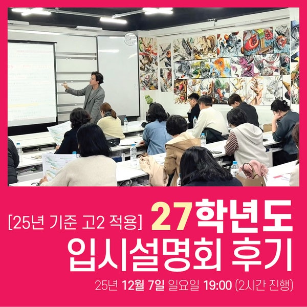 안녕하세요 홍대입시미술학원 G1지원입니다. 지난 25년 12월 7일(일요일), 현 고2 학부모 대상으로 한 27학년도 미대입시설명회를 무사히 마쳤습니다. 귀한 시간 내어 멀리서 참석해 주신 학부모님들께 다시 한번 감사의 말씀 전합니다! 이번 입시설명회에서는 기말고사가 끝난 이 시점, 곧 다가오는 겨울방학에 앞으로 입시 방향 결정에 대해서 더 자세히 설명해 주셨습니다. '그렇다면 왜 이렇게까지 자세하게 알아야 할까요?' 수시모집과 정시모집 각 모집시기별로 다양해진 모집유형 수시모집으로 선발하는 미술대학의 전형은 교과전형, 학종전형, 실기전형 등으로 나누어 집니다. 정시모집에서는 서류전형과 실기전형으로 각 대학....... <img src="https://blogthumb.pstatic.net/MjAyNTEyMTJfMTM5/MDAxNzY1NTI4MzM3NTY3.1wzinTE7Skl_aXFQTsxZGSzuIk_2_8hk2Z4wYJ1twvcg.PIxXqSEfENVW7fe25aVkHmQSs-9x3fwFqqD6-EoJsFsg.JPEG/27_%C0%D4%BD%C3%BC%B3%B8%ED%C8%B8_%C8%C4%B1%E2_%BD%E6%B3%D7%C0%CF1.jpg?type=s3" />