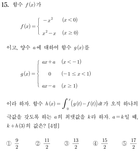 15번 문항 : 구간별로 정의된 함수의 극한, 미분, 적분
