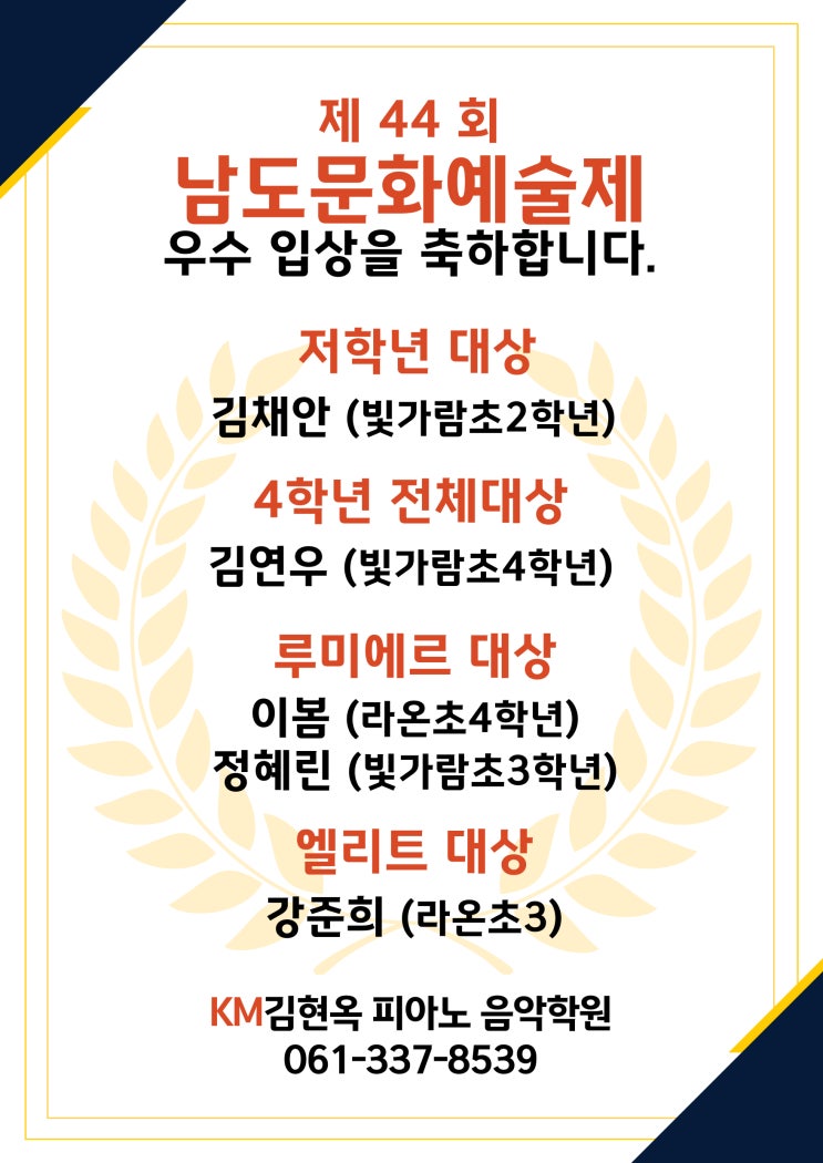안녕하세요! KM김현옥 피아노 음악학원 입니다. 가을 콩쿨 준비를 하면서 KM김현옥 피아노 음악학원 친구들 모두 남도문화예술제에서 대상으로 입상을 했답니다. 남도문화예술제 입상 나주혁신피아노학원 KM김현옥 피아노 음악학원 아이들이 용기 내어 도전하고 멋진 결과 저학년대상 4학년 전체대상 루미에르 대상 엘리트 대상 정말 대단한 우리 친구들 멋진 실력! KM김현옥 피아노 음악학원 친구들 최고! 친구들의 멋진 모습 음악을 향한 진심 뜨거운 열정으로 우리 친구들에게 큰 결실로 돌아와서 선생님도 부모님들도 모두 감동한 남도 국제 음악 콩쿠르 입니다. 고사리 같은 손으로 매일매일 연습하고 또 연습한 우리 친구들 친구들과....... <img src="https://blogthumb.pstatic.net/MjAyNTEyMTVfMTU2/MDAxNzY1ODA0NDg4MzM4.zkyloacU942efIhgul7uXcP4relzTd5kNF3gSKws74kg.LCrQpoXsjWJ-kJGd2nZMev8pjN1y3Ynbmc9AM5o1-2Ig.JPEG/001.jpg?type=s3" />