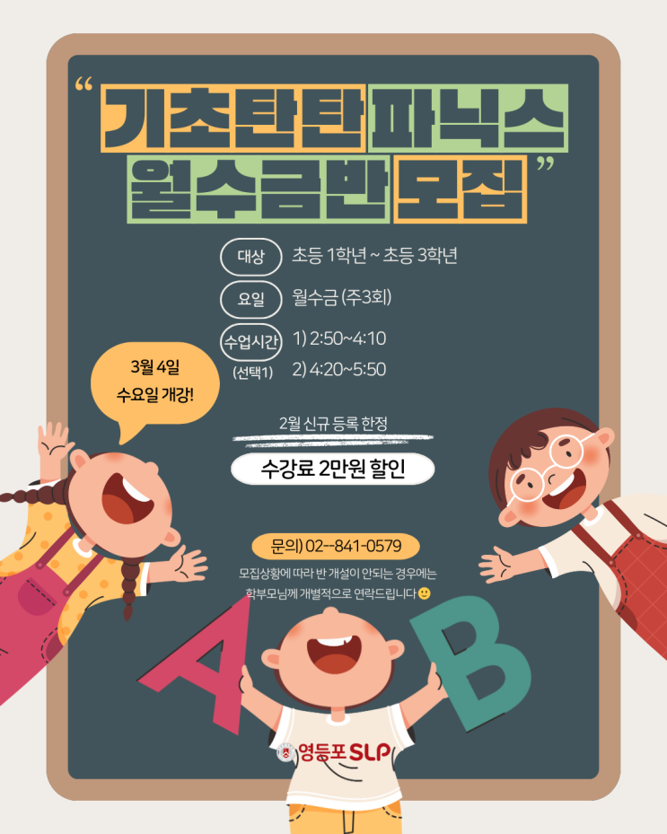 안녕하세요, 영등포 SLP입니다. 초등 저학년의 영어 학습에 있어 파닉스는 이후 학습의 기반이 되는 중요한 과정인데요! 새학기를 맞아 3월부터 기초탄탄 파닉스 월수금반을 모집합니다! 초등 1~3학년 대상으로 진행되는 과정이며 수업 시간은 2시 50분, 4시 20분 시작 중 선택하실 수 있습니다. 2월에 신규 등록생에 한해 수강료 할인도 제공되고 있으니 많은 관심 바랍니다 :) <img src="https://blogthumb.pstatic.net/MjAyNjAyMDZfMTAx/MDAxNzcwMzY3NTI4NzAz.DjRPZLiCsUOKFlZ13iIICUZF56LAJxZtEL_m5CfXzY8g.zZXI7IlMa88V0ZPNoziVjTGfVju7EK3AQFGSL5yHEcwg.PNG/KakaoTalk_20260206_173726274.png?type=s3" />