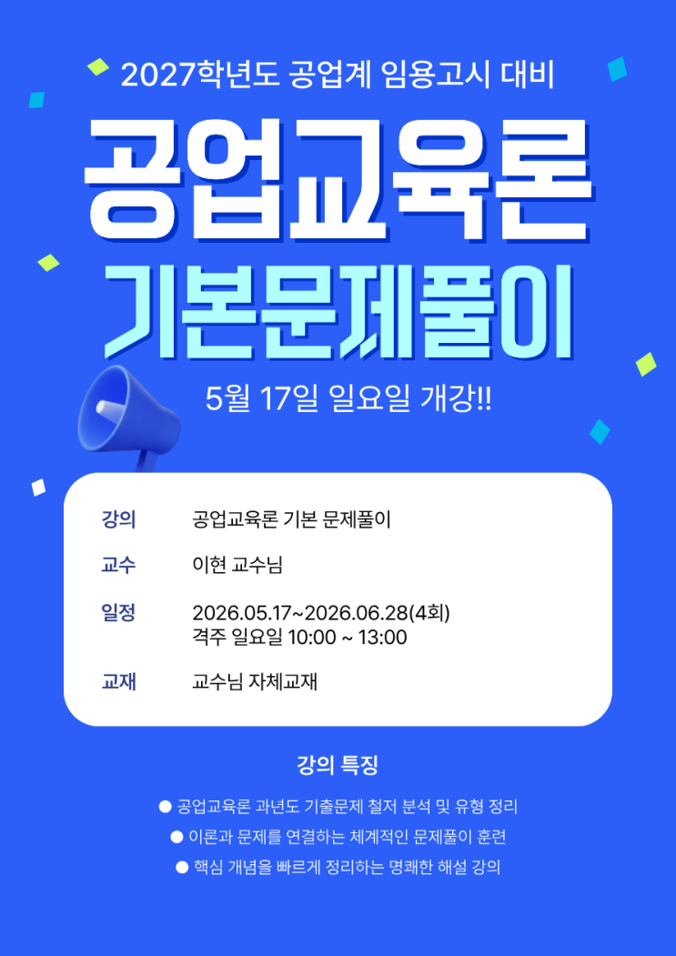 안녕하세요, 일등고시학원 고시로입니다 2027학년도 공업계 임용시험을 준비하는 수험생들을 위한 이현 교수님의 ‘공업교육론 기본문제풀이’ 강의가 오는 5월 17일 개강합니다! 공업교육론은 암기만으로 해결되지 않습니다. 이론을 어떻게 문제에 적용하느냐가 합격을 좌우합니다. 이번 강의를 통해 기출 분석 → 개념 정리 → 문제 적용 → 실전 대비까지 한 번에 완성해보세요. <강의 안내> 강의명 : 공업교육론 기본 문제풀이 교수 : 이현 교수님 개강일 : 2026년 5월 17일 일요일 강의기간 : 2026.05.17 ~ 2026.06.28 (총 4회) 강의시간 : 격주 일요일 10:00 ~ 13:00 교재 : 교수님 자체교재 이런 분들께 추천합니다 기출문제를....... <img src="https://blogthumb.pstatic.net/MjAyNjA0MjVfMTYw/MDAxNzc3MDgwODQzNDk5.Hnpa82iphEMN8PIV_UNEp7rd65WfaG2d_zY6FAXXPfIg.dnjXNChnHwzg-Tml1ZVq573neUVdAyFMaZt6z6v4r7og.PNG/1-%B0%F8%B1%B3_%B1%E2%BA%BB%B9%AE%C7%AE.png?type=s3" />