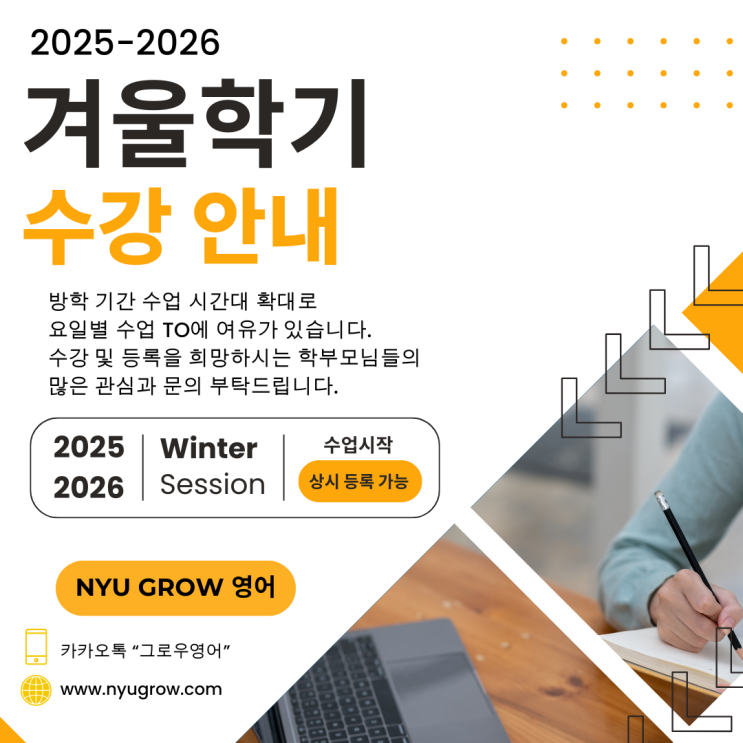 2025–2026 겨울학기 수강 안내 방학을 실력으로 채우는 시간, NYU GROW 영어 방학은 학생의 학습 흐름이 달라질 수 있는 중요한 시기입니다. 쉬는 동안 무너지기도 하지만, 반대로 가장 빠르게 실력을 끌어올릴 수 있는 기회이기도 합니다. https://blog.naver.com/chris_tr/223952846643 NYU GROW 영어에서는 2025–2026 겨울학기 수업 시간대를 방학 기간에 맞춰 확대하여 실시합니다. ▶방학 기간 수업 시간대 확대 방학 기간 동안 수업 시간대가 확장되어 요일별 수업 TO에 여유가 있습니다. 수강 및 등록을 희망하시는 학부모님들의 많은 관심과 문의 부탁드립니다. ★ 2025-2026 Winter Session 안내 ★ -수업 시작: 상시 등록 가능 -대상....... <img src="https://blogthumb.pstatic.net/MjAyNTEyMjJfMTk5/MDAxNzY2MzkwMDM1MDEx.Z5pD8lQ_idLPujhPrOhHyzJbY9lvoJM8nSW1OHr7EaEg.2oIzbotU0vudGp1tUJeEA_R0SY2cnkWY4f9D8jNcQmgg.PNG/%B0%DC%BF%EF%C7%D0%B1%E2_%B5%EE%B7%CF%BE%C8%B3%BB.png?type=s3" />