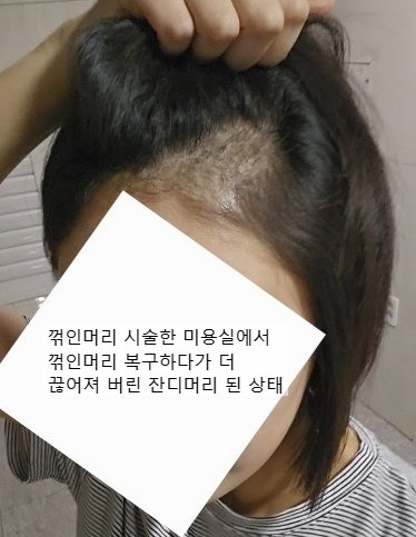 꺾인머리 복구는 한달 기다리면 끊어져 나갑니다. 발견 즉시 1차 복구를 하고 3주 후에 2차 복구하면 90% 이상 복구가 됩니다. 꺾인머리 복구 하기 위해서 한 달 기다리는 동안에 매일매일 끊어져 나갑니다. 꺾인머리 1차 복구는 응급 처치 입니다. 응급 처치가 잘못 되거나 늦어지면 사진처럼 끊어져 버리고 살릴수 있는 모발들이 잔디머리가 됩니다. 그런데 고객님은 꺾인머리 만든 미용실에서 1차 복구 시술을 하다가 더 망가진 상태입니다. 정확하게 모르면 꺾인머리 복구 전문가에게 보내야 더 큰 손해배상을 하지 않게 됩니다. <img src="https://blogthumb.pstatic.net/MjAyNTEyMjdfMTA2/MDAxNzY2ODE4MzU5NTQw.mFFnmGGQv6XFj_XvN2tCmA90nRc9NlUXi6Zn7hdWmMIg.YeqxMbci1G6xoCtRqTlJDiQNLFMHjckp99EogrenkdMg.JPEG/%C4%AB%C4%AB%BF%C0%BD%BA%C5%E4%B8%AE_2025_12_26_22_58_56.jpg?type=s3" />