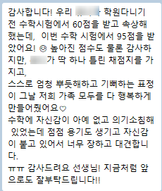 초등 수학, 학년부다 '실력'이 먼저입니다 많은 학부모님들이 "우리 아이가 몇 학년 과정까지 선행했는지" 를 걱정합니다. 하지만 수학에서 더 중요한 것은 얼마나 앞서 나갔는지가 아니라, 얼마나 정확히 이해했는지 입니다 중요한 것은 남들과 비교한 속도보다 아이에게 필요한 단계에서 시작하는 것입니다. 1:1 맞춤 수업으로 진행됩니다 진단 테스트 학원 등록 전 테스트와 상담을 통해 개념 이해도, 문제 해결력 등을 꼼꼼히 확인합니다. 2. 개별 학습 설계 테스트 결과를 바탕으로 어머님 상담을 통해 아이의 학습 계획을 설계합니다. 3. 1:1 개념 중심 수업 개념 설명→문제 적용→질문응답→오답 피드백을 반복하며....... <img src="https://blogthumb.pstatic.net/MjAyNjAzMDZfMjMy/MDAxNzcyNzgzODIzOTE4.lYxFVENCGEIMSrbAVqFQbDhks7jFbjL_iCUULXnP3c8g.Ue7JbgK2qbYHFAFZOmziFiWKAmbb6EzUgLBCxp7vTrsg.PNG/KakaoTalk_Snapshot_20260306_164515.png?type=s3" />