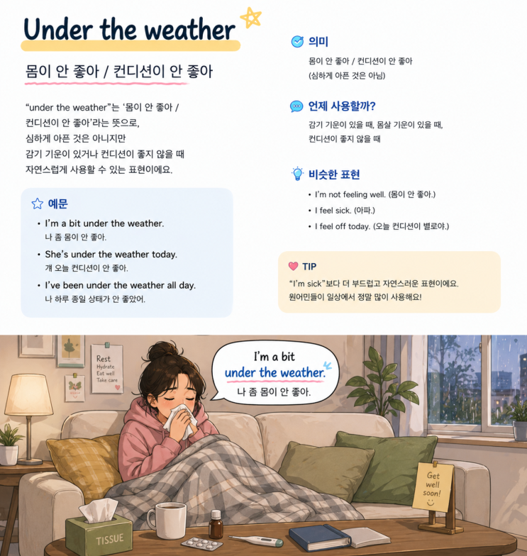 DAY 3 - Under the weather 몸이 안 좋다 / 컨디션이 안 좋다 / 아프다 Under the weather 는 몸이 안 좋아, 컨디션이 안 좋아 라는 뜻으로, 심하게 아픈 것은 아니지만 감기 기운이 있거나 컨디션이 좋지 않을 때 자연스럽게 사용할 수 있는 표현이에요. 1. 공부 상황 A: Why do you look so tired? 왜 이렇게 피곤해 보여? B: I’m a bit under the weather. 나 좀 컨디션 안 좋아. A: You should get some rest. 좀 쉬어야겠다. 2. 회사 업무 상황 A: Are you okay? 괜찮아? B: Not really… I’m under the weather today. 아니… 오늘 몸이 좀 안 좋아. A: You should go home early. 오늘 일찍 들어가. 3. 약속 취소 상황 A: Can we meet t....... <img src="https://blogthumb.pstatic.net/MjAyNjA0MjhfMTY3/MDAxNzc3MzQxNTcyNjM4.8BrwUgxNqvJ4iyslFM9iO6Q-QBs79pBDUbUzWYLJlWIg.--Fc21fX_QkIV7j0-3ntFdpKoKHE7CKMJ_KBPfJ8JOEg.PNG/ChatGPT_Image_2026%B3%E2_4%BF%F9_28%C0%CF_%BF%C0%C0%FC_10_59_19.png?type=s3" />
