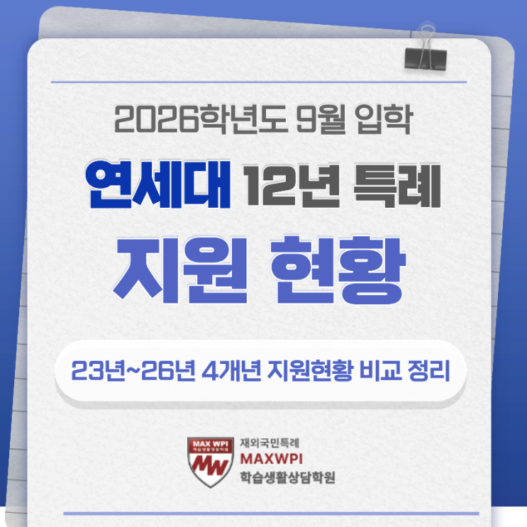 안녕하세요! 재외국민특례 맥스WPI의 맥스비입니다~ 지난주에 26학년도 9월 입학을 위한 12년 특례 (초중고 전교육과정이수자 전형)의 연세대, 고려대, 이화여대의 원서접수가 마감되었습니다. 연세대의 12년 특례 지원현황과 특징을 정리해드리겠습니다. 연세대 연세대는 25학년도 9월입학 때는 수시 6회 지원횟수 폐지 영향으로 24학년도 9월입학에 비해 약 30% 가까이 증가한 인원이 지원했습니다. 26학년도 9월 입학 지원 인원은 지난해보다 약 8%인 76명이 줄었지만 6회 제한이 있던 시기보다는 여전히 20% 이상 더 많은 인원이 지원해, 고려대와 마찬가지로 지원횟수 폐지 영향이 지속되는 것으로 보입니다. 글로벌인재대학 증감의 흐름이....... <img src="https://blogthumb.pstatic.net/MjAyNjAzMTZfNzUg/MDAxNzczNjQ4NzQ5MTcz.R1SbBT2XaN70YQZK6evzexweFiKHRE_u6VD_x2T5HQwg.5Qe9Kw7RJVhDLbZBR4A1bdpIWaLQexT_spROQEGLFW0g.PNG/%C1%A6%B8%F1%C0%BB_%C0%D4%B7%C2%C7%D8%C1%D6%BC%BC%BF%E4._%284%29.png?type=s3" />