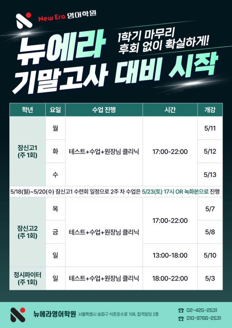 안녕하세요. 뉴에라(New Era) 영어학원입니다. 26년 1학기 기말고사 내신 대비 반 개강 안내해 드립니다. 일정 미리 참고하시어 원하시는 반으로 수강 신청 부탁드립니다:-) 어린이날 연휴 안내 5/5(화) 어린이날은 학원 휴원으로 해당일에 신청하신 경우, 5/6(수) 14시 이후 순차적으로 반 확정 문자 전달 예정입니다. [잠신고 1학년] ▼▼▼수강 신청 링크▼▼▼ 5월 1일 16시에 공개 예정 ❤️잠신고1 기말고사 내신 대비 반 (월요일)❤️ - 개강: 5/11(월) 개강 - 일정: 주 1회, 매주 월요일 17:00~ 22:00 진행 ❤️잠신고1 기말고사 내신 대비 반 (화요일)❤️ - 개강: 5/12(화) 개강 - 일정: 주 1회, 매주 화요일 17:00~ 22:00 진행 ❤️잠....... <img src="https://blogthumb.pstatic.net/MjAyNjA0MjlfNzgg/MDAxNzc3NDQ5MzgwNDU1.Ii2mTOoO5O6FYTgui1JGTCPJanUyR1S_yX4m_QUDMgEg.fyXwmB2jxx6UxM9e-hineE20inkqKReLq4Ea0ai4jM0g.JPEG/26%B3%E2_1%C7%D0%B1%E2_%B4%BA%BF%A1%B6%F3_%B1%E2%B8%BB_%C3%D6%C1%BE.jpg?type=s3" />