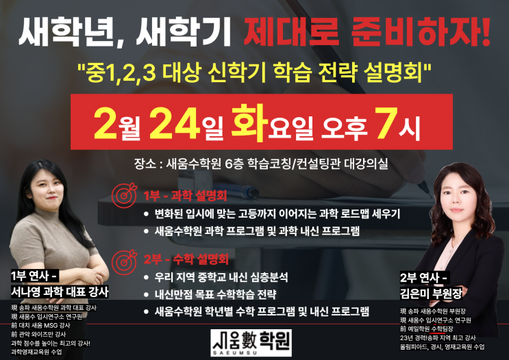 [새움수학원] 중1,2,3 대상 신학기 학습 전략 설명회(2/24[화] 오후7시)