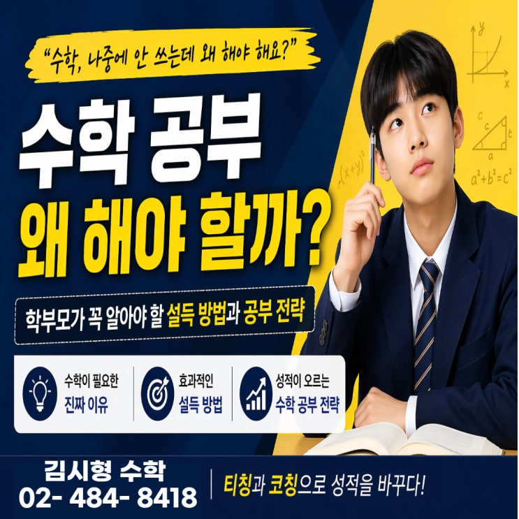 안녕하세요? 강동구 김시형수학입니다. 학부모 상담을 하다 보면 가장 많이 듣는 질문이 있습니다. “수학, 나중에 안 쓰는데 왜 해야 해요?” 이 질문은 단순한 반항이 아니라 대부분의 학생들이 공부를 피하기 위한 논리를 만드는 과정에서 나옵니다. 그래서 중요한 것은 감정적으로 설득하는 것이 아니라, 논리적으로 반박하기 어려운 구조를 만들어주는 것입니다. 수학 전문가에서 수학을 배워야 한다 (학교 선생님 출신 원장님 직강) 1. 수학 공부 설득의 진짜 목적 많은 학부모님들이 기대하는 것은 “설득하면 학생이 갑자기 열심히 한다”는 변화입니다. 하지만 현실적으로 그 확률은 높지 않습니다. 설득의 목적은 다음과 같습니다. - 공....... <img src="https://blogthumb.pstatic.net/MjAyNjA0MjRfMTI1/MDAxNzc3MDE3MzIwMzU4._fdD_O4-xm7_9Af4IZ0KgW6p4_QBbDmJ6yJBbH5BdFcg._ATEVdU5P-lYIoJFm4tOQIpxl2XC-cEjayJMFHGiS24g.JPEG/%C1%A6%B8%F1%C0%BB_%C0%D4%B7%C2%C7%CF%BC%BC%BF%E4_%288%29.jpg?type=s3" />
