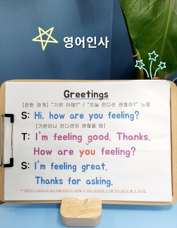 아무리 쉬운 영어 표현도 입에서 계속 내뱉지 않으면 절대 입에 붙지 않습니다. 그래서 와튼캠퍼스 영어학원에서는 매일 등원·하원 시간, 선생님과 학생이 영어로 인사를 나누는 습관을 만들고 있습니다. 영어는 외워두는 지식이 아니라, 사용하면서 익숙해지는 언어이기 때문입니다. ✔ 매일 반복하는 영어 인사 예시 A: Hi, how's it going? B: It's going well. Thanks. How about you? A: Same here. Just the usual. Thanks for asking. 아주 쉬운 표현들이지만, 이 문장들을 매일 입으로 꺼내는 경험이 쌓이면 아이들은 영어를 ‘아는 것’에서 그치지 않고 자연스럽게 말할 수 있게 됩니다. ✔ 4주 반복 루틴으로 입에 붙입니다....... <img src="https://blogthumb.pstatic.net/MjAyNjAxMzBfMjg0/MDAxNzY5NzczMzg3NDY4.tIrQjjPnW01siZ7wttxy6QN3tsqIdXRonuSCzt9ZA2Ag.LJdmErA1VA2P5gANfAWqKZ1fZ698RJWvmGhhJywJgq8g.JPEG/%B4%D9%BF%EE%B7%CE%B5%E5_%281%29.jpg?type=s3" />