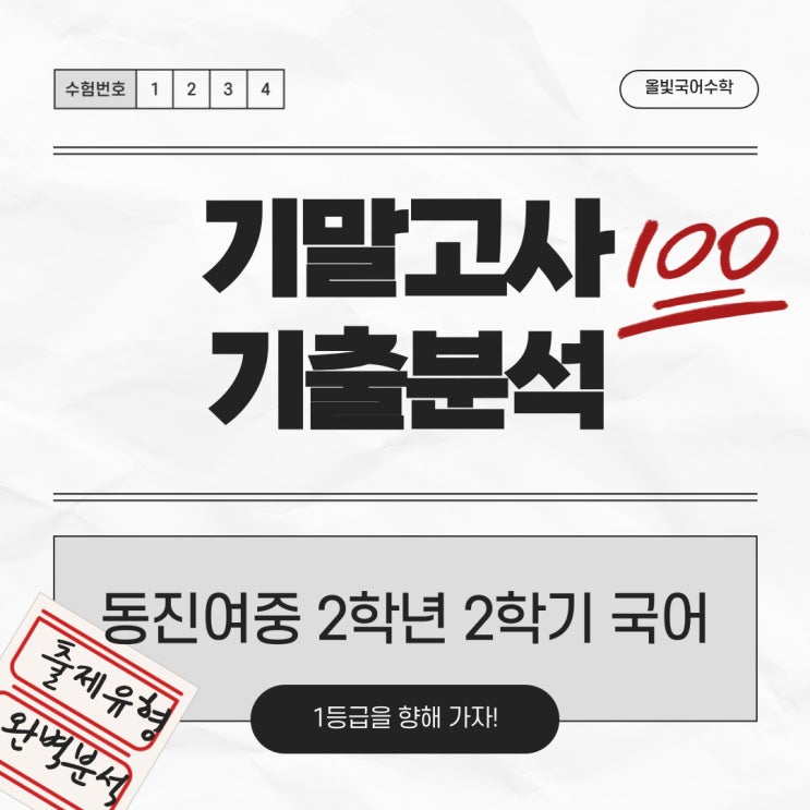 세상에 빛나지 않는 별은 없다! 안녕하세요. 진해 국어, 수학 학원 올빛국어수학입니다. 오늘은 2025. 동진여중 2학년 2학기 국어 기말고사 기출문제 분석을 실시합니다. 시험범위: 3(1) 설명 방법 파악하며 읽기 3(2) 설명하는 글 쓰기 4(1) 매체 자료의 효과 판단하며 듣기 4(2) 매체 바르게 읽기 총 평 시험 범위는 소단원 4개로 평균적인 분량에 해당합니다. 문제는 100% 서술형으로 출제되었으며, 총 10문항이지만, 한 개의 문항을 여러 개의 소문항으로 나누어 출제하여 실제 문항 수는 36문항으로 많은 편입니다. 문항 수가 많은 편이기 때문에 문항 당 배점은 작지만, 서술해야 하는 양이 많아지기 때문에 어려움이 있을 수 있습니다. 전....... <img src="https://blogthumb.pstatic.net/MjAyNjAyMDNfMjAy/MDAxNzcwMTA2MjU2MTAy.i8FF4A4QmqzwBvZoJGpVWcHJSR1wp_d8WXMXiVwzlRMg.mEPuhXByZ3G9xe1d_P8QFl_2eVSfVV9hsYm4tf1sZ98g.JPEG/%C1%A6%B8%F1%C0%BB-%C0%D4%B7%C2%C7%D8%C1%D6%BC%BC%BF%E4_-001_%281%29.jpg?type=s3" />