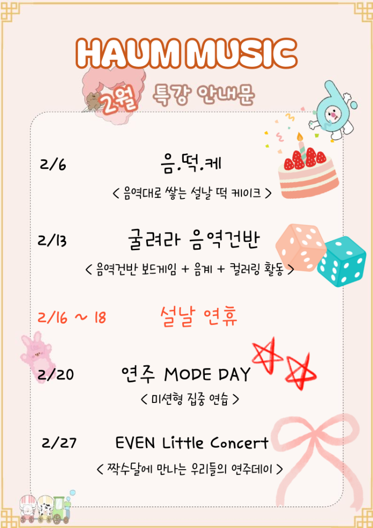 2월 특강 안내문 2월의 교육은 설날의 전통 문화와 예절을 음악 개념과 함께 경험하는 통합 창의 수업을 진행합니다 음계와 음역대에 대한 활동과 연계하여 학습하며, 손을 사용하는 활동을 통해 소근육 발달과 집중력 향상을 돕습니다 또한 생활 속 소재를 활용한 활동으로 아이들 눈높이에 맞게 사고력과 표현력을 확장하고, 음악을 매개로 개념 이해와 창의적 표현을 동시에 강화합니다 음계와 음역을 배우는 특강들과 짝수달에 만나는 우리들의 연주데이까지 ! ✨ 2월에도 웃음가득 행복가득하게 배워요 ! ️ 상담안내 <img src="https://blogthumb.pstatic.net/MjAyNjAyMDRfMzcg/MDAxNzcwMTM3ODE2NjE4.LWcK6-UUG8CZCMDI9SK3yVNILPhGkjD3Z8W3tWA7Y1Mg.bHZyAnngTCaWzwK5dZs1Z2zGZH1tDzJKY9zEnHUOlGsg.PNG/IMG%A3%DF3651.PNG?type=s3" />