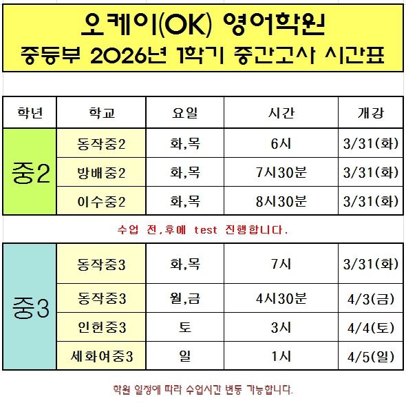 OK 영어 학원은 학교 시험에 맞춘 교과서 완벽 분석 본문, 문법, 서술형까지 빈틈없이 대비합니다. 실전 모의고사와 꼼꼼한 피드백으로 시험에서 결과를 만듭니다. OK 영어학원에서 내신 고득점을 위한 체계적인 프로그램으로 2026년 1학기 중간고사를 준비합시다 ~ !!!!!! ✅ 동작구 내신 대비는 역시 OK 영어학원 확실한 결과로 증명합니다. 위치: 이수역 14번 출구 오송 빌딩 3층 문의: 536-1032 #동작구 중등 영어학원 #중학교 영어 내신 준비 #서술형 문항 대비 #영어 수행평가 대비 #중등 OK 영어학원 #서답형 완벽 대비 #이수역 중등 영어학원 #동작중 영어 내신 #사당중 영어내신 #서문여중 영어학원 #동덕여중 영어학원 #OK영어수....... <img src="https://blogthumb.pstatic.net/MjAyNjAzMTZfMTE3/MDAxNzczNjQzNjQ5Mzgw.qTSiuXVPVIITIlsmJkrLqv-50IdhGolELKDDBpaBnpUg.mngvoq0nOGD1NJKuGR--6lRk0XMEGl6VKBS46nCXbMsg.JPEG/20260316_153522.jpg?type=s3" />