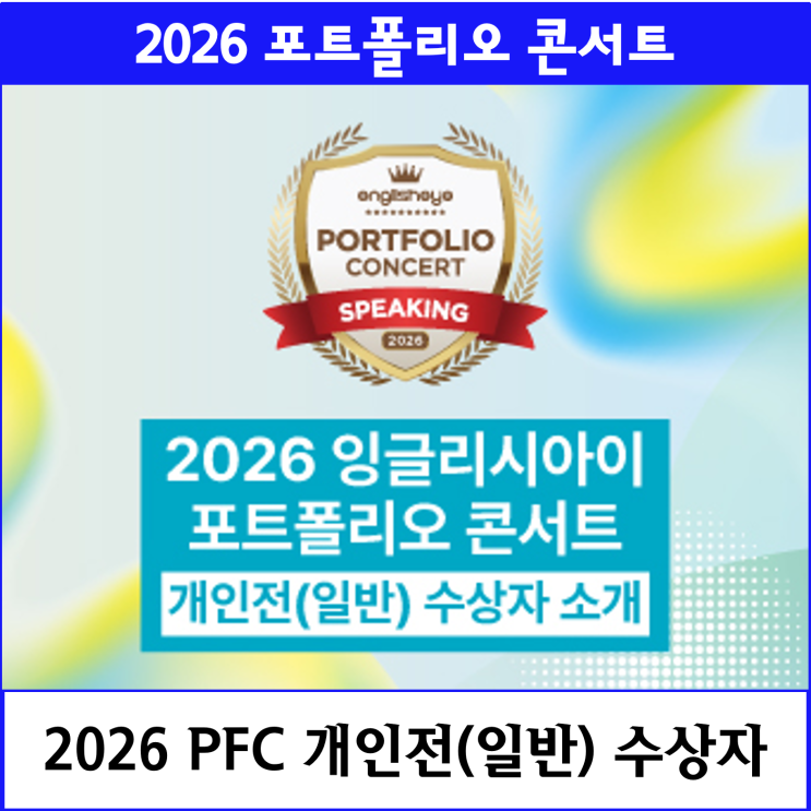 안녕하세요. 잉글리시아이입니다:) 10주년을 맞이해 더욱 즐거웠던 축제, 2026 잉글리시아이 포트폴리오 콘서트가 성황리에 마무리되었습니다. 2026 잉글리시아이 포트폴리오 콘서트 참여를 위해 함께 노력하고 응원해 주신 잉글리시아이 원장님, 학생, 학부모님께 진심으로 감사드립니다. 지난 10년간 잉글리시아이 포트폴리오 콘서트에 보내주신 성원에 다시 한번 감사드리며 앞으로도 전국의 많은 학생들이 적극적으로 참여하고 모두가 즐길 수 있는 축제가 되도록 노력하겠습니다. 그럼 2026 잉글리시아이 포트폴리오 콘서트 개인전(일반) 수상자 영상을 소개합니다. 개인전 (일반) G1 [금상] 잉글리시아이 거제상동점 윤서후 [은상] 잉글리....... <img src="https://blogthumb.pstatic.net/MjAyNjAzMTZfNTkg/MDAxNzczNjQ0MjE1NzU1.XYEXNkPThqYFREIW8v06cq24jq9RnT1nIyYdYohXfzYg.wJ-YLRYIswaT0NG2ohry8BUEhuqSfMxDKPqvIJiJsLAg.PNG/%B1%D7%B8%B21.png?type=s3" />