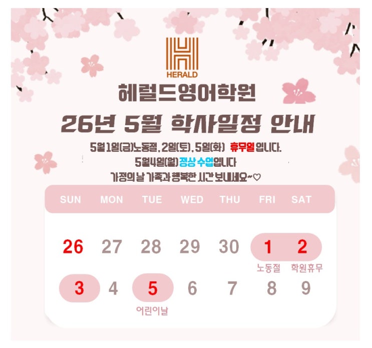 안녕하세요 헤럴드영어학원입니다. 한 달 반 동안 중 고등부 1차 시험 준비로 눈코 뜰 새 없이 바쁜 날을 보내고 이번 주면 모든 1차 고사가 완료됩니다. 다름이 아니라 5월 학사일정에 관련하여 공지를 올립니다. 5월 연휴 가족들과 행복한 시간 보내시기 바랍니다. 그리고 5월 4일(월)은 초등부 어린이날 행사가 있으니 많은 기대 부탁드립니다^^ 감사합니다. #통영영어학원 #통영학원 #통영영엉 #통영초등부영어 #통영중등부영어 #통영고등부영어 #통영영어전문 #통영원어민영어 <img src="https://blogthumb.pstatic.net/MjAyNjA0MjhfMjE3/MDAxNzc3MzY1NjM1MTg4.K8aHWFHiTgpV9rYjLKmMmDU-TcESgQkOYpdyRdOw2WMg.sAYBOB0jhZQg8zDxKMuvBoqNT2bVs9pISBUFZwzTwckg.JPEG/%C8%AD%B8%E9_%C4%B8%C3%B3_2026-04-28_170755.jpg?type=s3" />
