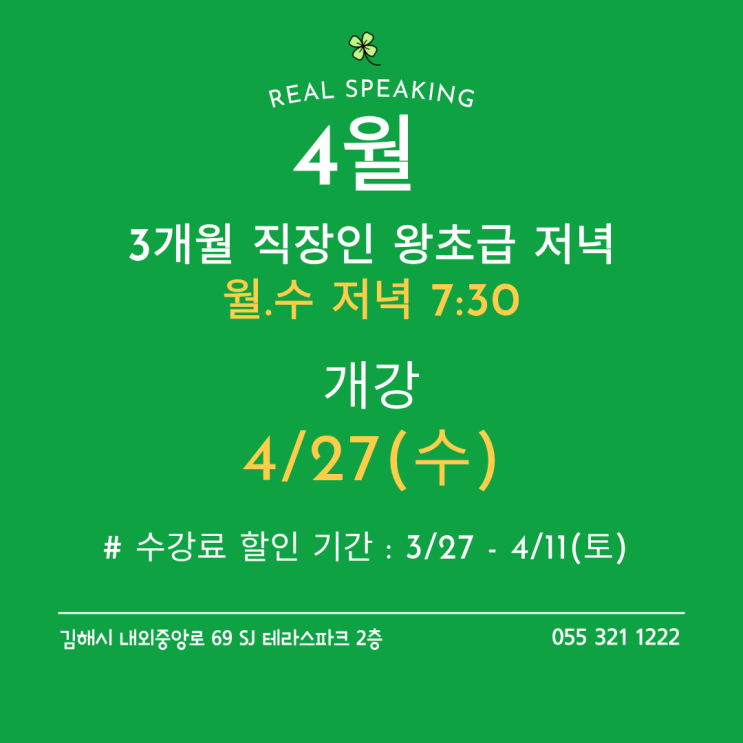 [월.수 저녁 직장인 왕초급 모집 시작]리얼스피킹어학원 김해성인영어 김해성인영어회화 김해토익 김해오픽 김해토스 김해영어스터디 장유영어회화 율하영어회화