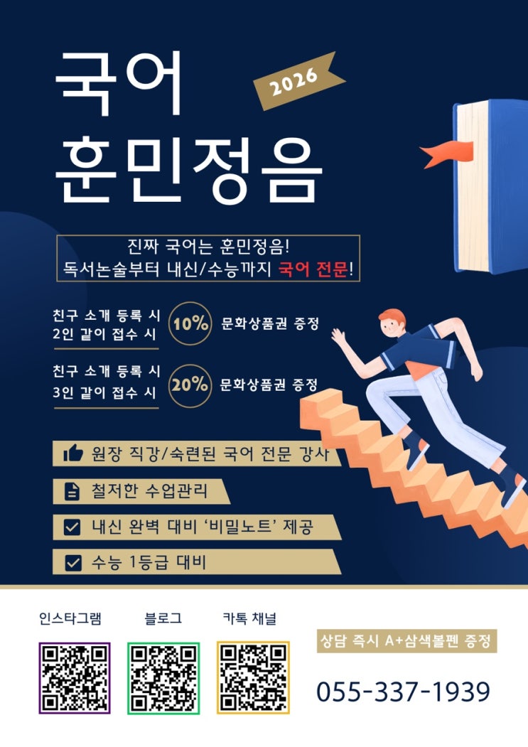 안녕하세요~ 김해 장유 훈민정음 국어학원입니다. 따뜻한 3월이 시작되었네요! 이제 시험기간이 시작되기도 했죠. 그래서 3월 이벤트와 작년 성적향상 학생들을 소개하려고 해요. 3월 이벤트 안내 성적 향상 학생 소개 열정적인 훈민정음 쌤들과 함께 중간고사 성적 높여볼 학생들 ~! 문의 주세요 : ) #훈민정음 #훈민정음국어학원 #장유훈민정음 #장유국어 #장유국어학원 #장유학원 #장유맘 #장유학원추천 #장유고 #삼문고 #김해대청고 #능동중 #내덕중 #월산중 #장유중 #대청중 <img src="https://blogthumb.pstatic.net/MjAyNjAzMjhfMTYy/MDAxNzc0NjYyNzU5Nzcy.Fq8PCxG4TWvA08_HlJFim4v8IGkzDan2LTpfpLkyfhog.k3P2mBeeRcJTE8qZQ2n4ppJl5od2-jdJRNcW2UlvOcog.JPEG/IMG_5549.jpg?type=s3" />