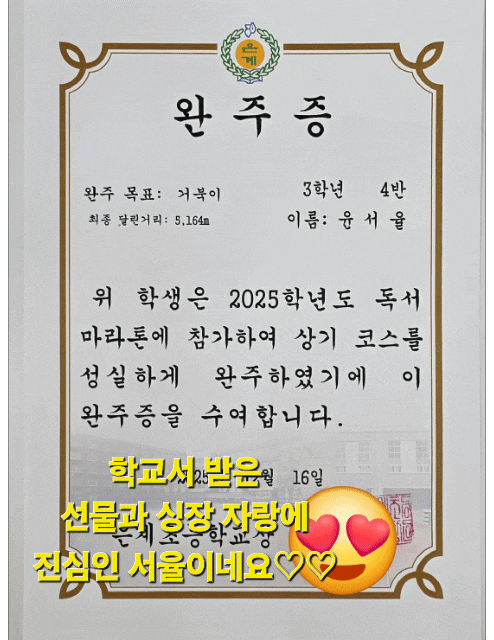 책을 좋아하는 아이란? 책을 좋아하는 아이는 책을 많이 읽는 아이라기보다, 책과 함께 성장하는 아이입니다. 이번에 아이가 받은 독서마라톤 완주증과 작은 선물 꾸러미를 보며 문득 이런 생각이 들었어요. ‘아, 이 아이는 책을 좋아하는 아이로 잘 자라고 있구나.’ 책을 좋아하는 아이의 모습 책을 좋아하는 아이들은 보통 이렇게 말합니다. “이 부분이 제일 재미있었어요.” “주인공이 왜 그렇게 했는지 알 것 같아요.” “이 책 다음에는 이런 책도 읽어보고 싶어요.” 책을 읽은 뒤, 생각이 남아 있는 아이 이야기를 자기 말로 풀어낼 수 있는 아이 책을 ‘과제’가 아니라 ‘경험’으로 받아들이는 아이 이런 아이....... <img src="https://blogthumb.pstatic.net/MjAyNTEyMTZfMTkz/MDAxNzY1ODc1MTcxODA5.BNmzcYWHrgEpy25uo13Z0u9vwF8rnGXOYGda6Cw5HY0g.e7P90O3v4Pi1q3dPYNpgWWWqe2Ev3BAU-D8B6CLplJsg.GIF/20251216%A3%DF160155.gif?type=s3" />