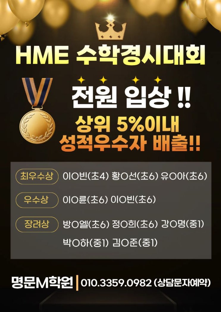 HME 수학경시대회 전원 입상! 상위 5% 성적우수자 배출! 명문M학원은 다릅니다!!
