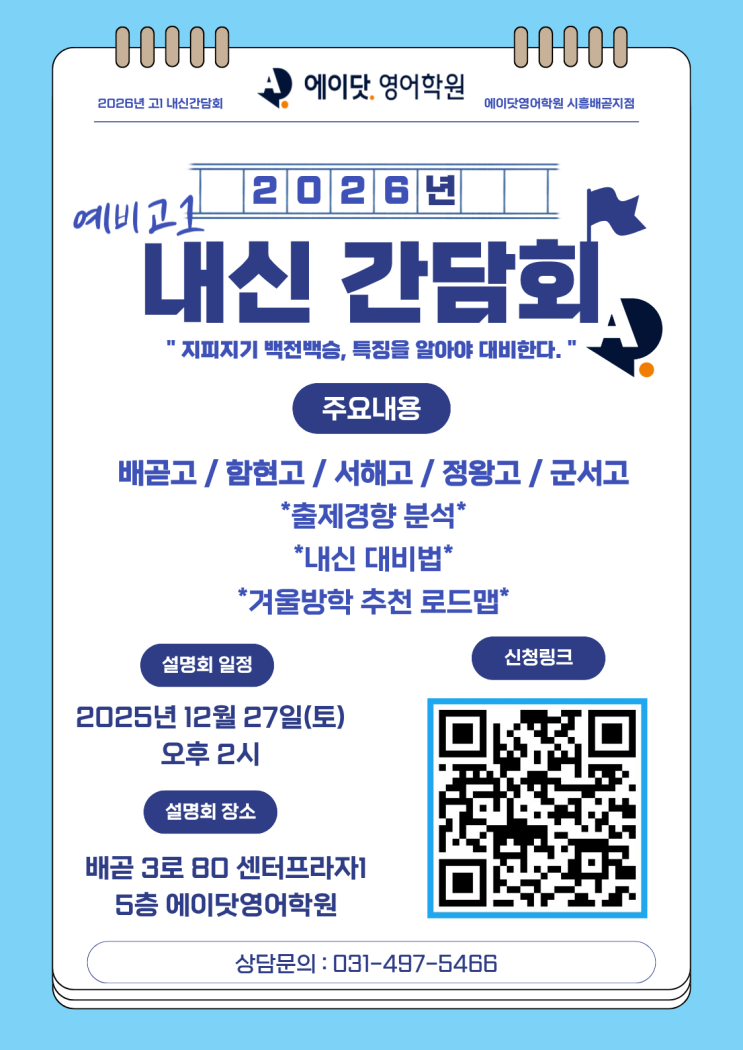 예비 고1 · 중등을 위한 시흥지역 맞춤 입시설명회 다가오는 고교 선택 시즌, 우리 아이가 진학할 학교의 영어시험은? 설명회 주제: 「학교별 내신분석 및 겨울방학 대비법 」 일시: 2025년 12월 27일(토) 오후 2시 장소: 에이닷 영어학원 시흥배곧지점 참석자 혜택: 설명회 참석 시 입시자료집 선착순 증정 설명회 주요 내용 |✔ 배곧고 / 함현고 / 서해고 / 정왕고 / 군서고 ✔ 학교별 출제경향 분석 ✔ 내신 대비 전략 ✔ 겨울방학 학습 로드맵 이런 분들께 추천드립니다 ✔ 중학교와는 완전히 다른 고등 내신, 어떻게 준비해야 할지 막막한 학부모님 ✔ 학교별 출제경향을 정확히 알고 전략적으로 대비하고 싶....... <img src="https://blogthumb.pstatic.net/MjAyNTEyMTlfNjEg/MDAxNzY2MTQ1NzAyMDI0.JhotGgK33sK2mpe1eY9gUbI1uwBfYaZTGSGRQIDSFy0g.GrEnFg1EpyXHNzM7chEglMCQ03RWsBil_uPK4EWhz6og.PNG/KakaoTalk_20251219_204813429.png?type=s3" />