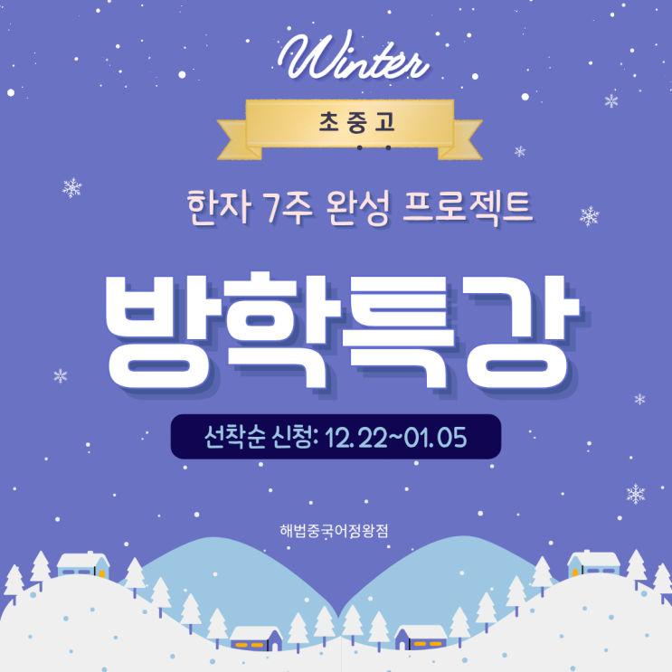 따쨔하우! 시흥시 정왕동 영남 1단지 상가동에 위치한 중국어, 한문 전문학원입니다. 2025년의 12월 중반도 넘어서서 새 해가 훌쩍 다가오고 있네요. 2025년도 금방 적응한 것 같은데 2026년 새해라니~ 올해도 아쉬움이 많이 남는 한 해가 되었군요. 시흥시 정왕동에 위치한 대부분의 초중고등학교는 1월 초에 겨울방학을 맞이해요. 우리 중국어 학원도 방학 시즌을 맞아 방학 특강을 준비했답니다. 올해는 한자 수업 문의가 많아서 한자 방학 특강을 야심차게 준비해 봤습니다. 고심해서 만들 특강이라 여러모로 훌륭한 수업이 되리라 굳게 믿어요. 한자는 왜 배워야 하는가? ▷어휘력 및 문해력을 향상: 우리말 어휘의 70%가 한자어로 이루어 짐....... <img src="https://blogthumb.pstatic.net/MjAyNTEyMjBfMjgz/MDAxNzY2MjA5MjY2MDIx.d4CJaoaNjiWc09kJMBiZoUYug6od_0BGYNu5OcKGRNMg.moTaSjwSClecT4r-jzdRKYa_seNDvX5Yuaa--4MET8Mg.PNG/%B9%E6%C7%D0%C6%AF%B0%AD-%C7%D1%C0%DA.png?type=s3" />