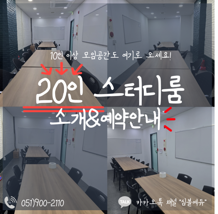 안녕하세요! 심블스터디룸입니다. 10인 이상~20인 이내 인원이 사용할 만한 회의실, 모임공간 찾기 정말 어렵잖아요~ 심블스터디룸에서는 최대 20인까지 수용이 가능한 [20인실]을 새로 구비하여 소개드리려고 합니다! 위치안내 20인 스터디룸(강의실x)은 기존 이용하셨던 심블스터디룸에서 도보 약 5분정도의 거리에 위치하고 있답니다! 주소 : 부산시 부산진구 중앙대로 680번길 26, 2층 (결제 - 1층 데스크) ※기존 심블스터디룸과는 다른 위치에 있다는 점 꼭 참고해 주세요!※ 20인룸 소개 공단기부산학원 2층에 위치한 20인실은 20인내 인원이 회의, pt공간으로 사용하기에 알맞은 공간이에요! 룸 내부에 화이트 보드가 부착되어 있고....... <img src="https://blogthumb.pstatic.net/MjAyNjAxMTVfMTQw/MDAxNzY4NDU3NjY2Mjky.4S2SJtpD_i3xJGB65-Z_3VFtp2U3qEUsETcSyj3xTXQg.uY11eqpKOI2PvzgCe0qqacWO88jqr-4ch2lgWtZCbzYg.PNG/260115.png?type=s3" />