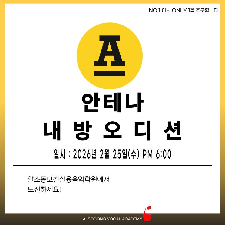 오늘은 안테나 내방오디션 소식입니다. 오디션 일정 및 자세한 사항은 아래를 참고해주세요. 안테나(Antenna) 내방오디션 ■ 지원자격 ~ 2006년생이하 성별무관 ■ 일정 - 2026년 2월 25일 수요일 PM 18:00 알소동보컬실용음악학원 ■ 지원분야 - 보컬/랩(무반주), 댄스(AR) 중 택 1 또는 중복 선택 가능 1) 보컬, 랩, 댄스 1분 이내 1곡 2) 보컬, 랩의 경우 마이크 및 앰프 사용 불가합니다. 3) 현장에서 추가곡(보컬/랩의 경우 댄스, 댄스의 경우 보컬/랩) 요청할 수 있는 점 미리 말씀드립니다. 내방오디션은 ▶엔터테인먼트 관계자가 학원으로 직접 방문 ▶이동없이 익숙한 공간에서 오디션 진행 ▶실력위주로 평가받을 수 있는 기회라는 점....... <img src="https://blogthumb.pstatic.net/MjAyNjAxMTVfMjM0/MDAxNzY4NDY2NTEwMTM4.mtqKKPJdk-As07rsxhAHSSsKXAjqAaxnjL41dgtvBqIg.VRgoNIYM7b_E_0nh3SQUVUh7mvjfMkgqipcvpi4us8Yg.JPEG/%BE%C8%C5%D7%B3%AA.jpg?type=s3" />