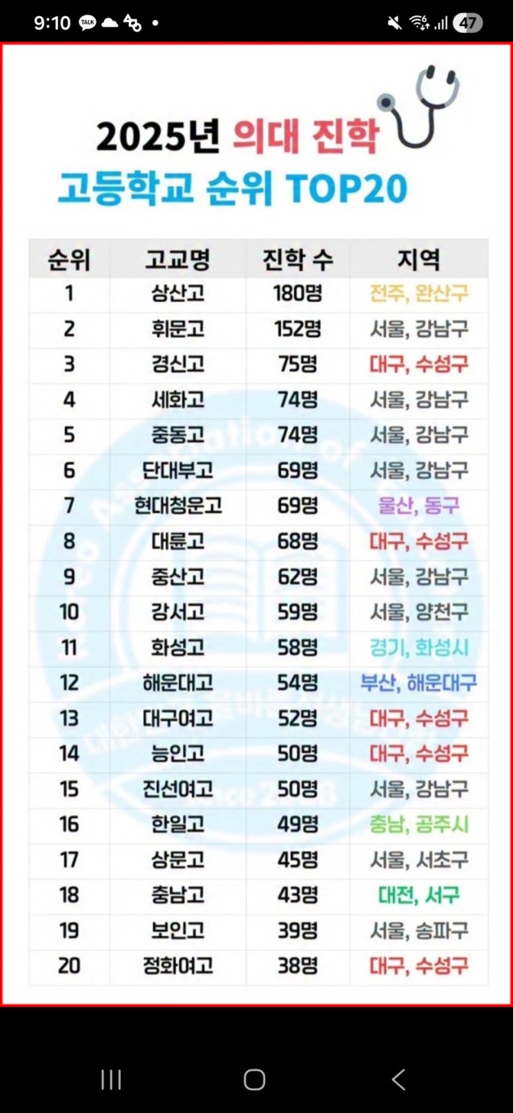 2025년 의대 합격 고등학교 순위 top20 (상산.휘문.수성구의 약진)