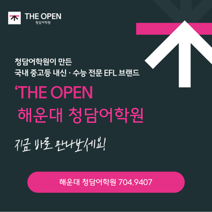 안녕하세요! 해운대 청담어학원 입니다^^ 최근 영어 교육 환경은 그 어느 때보다 빠르게 변화하고 있습니다. '깊이 있는 문해력'과 '실전 입시에서의 득점력'이 동시에 요구되는 시대입니다. 이러한 시대적 흐름에 발맞춰, 청담어학원이 제시하는 해법! ESL의 강점에 EFL의 전략을 더한 [The Open] Class를 소개합니다. [왜 'The Open'인가요?] 요즘 수능과 내신 영어를 한마디로 정의하면 '논리적 문해력의 싸움'입니다. 단순 암기식 영어로는 한계가 명확합니다. 배경지식을 바탕으로 고난도 지문을 분석하는 힘이 필요하죠. "사고력은 키우되, 성적은 확실하게!" The Open이 탄생한 이유입....... <img src="https://blogthumb.pstatic.net/MjAyNjAxMTlfOTkg/MDAxNzY4ODE1ODQ1NTkw.iiETqtLa47bwFn3mZy0r40AdF9aBCnq7gq7BdzgAQysg.r5I1ECZpACY4Li1xuKI2DsMnMudk00v79yiHZraZ4k4g.PNG/image.png?type=s3" />