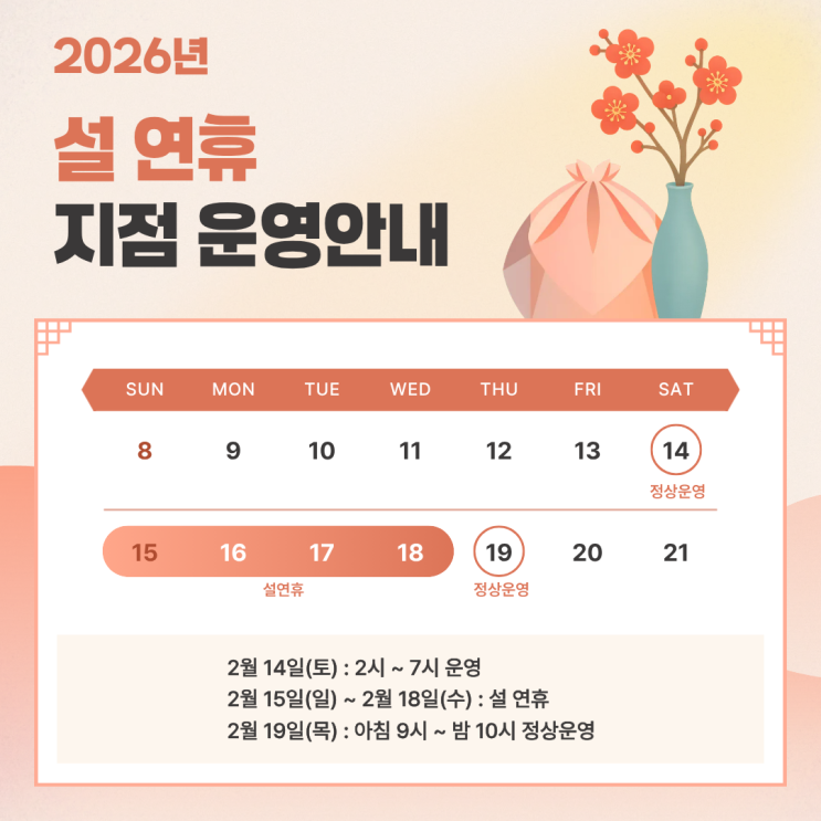 안녕하세요. 민족의 명절 설입니다. 이미 가족들과 일정을 시작한 분들도 계실텐데요. 이번 설 연휴 구서 에듀플렉스 운영은 어떻게 되는지 알아보도록 하겠습니다. 2월 14일 토요일은 평소와 같이 2시부터 7시까지 정상 운영합니다. 2월 15일부터 18일까지는 지점 휴무입니다. 2월 19일 목요일부터는 평소와 같이 아침 9시부터 밤 10시까지 정상적으로 운영됩니다. 각 학생별로 매니저와의 상담을 통해 학습량이 제시되어 있으니 참고바랍니다. 구서 에듀플렉스에 문의사항이 있는 분은 051-518-0039 로 연락바랍니다. <img src="https://blogthumb.pstatic.net/MjAyNjAyMTRfMjAw/MDAxNzcxMDQ4NDIwNzY2.lyoQAhWBRVEZSSOnqKZzhrfWZqb0N21OSgjeNd8dgk4g.r4jV9yy3iEoaikvMGaBaAd9c27vJ4xo5ei8aT9L5aZkg.PNG/%C1%A6%B8%F1%C0%BB_%C0%D4%B7%C2%C7%D8%C1%D6%BC%BC%BF%E4..png?type=s3" />